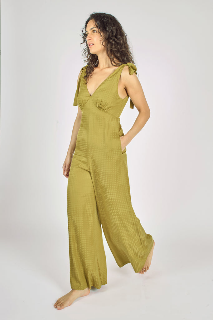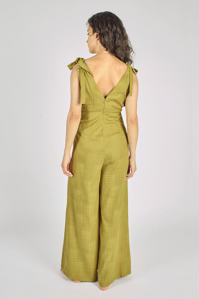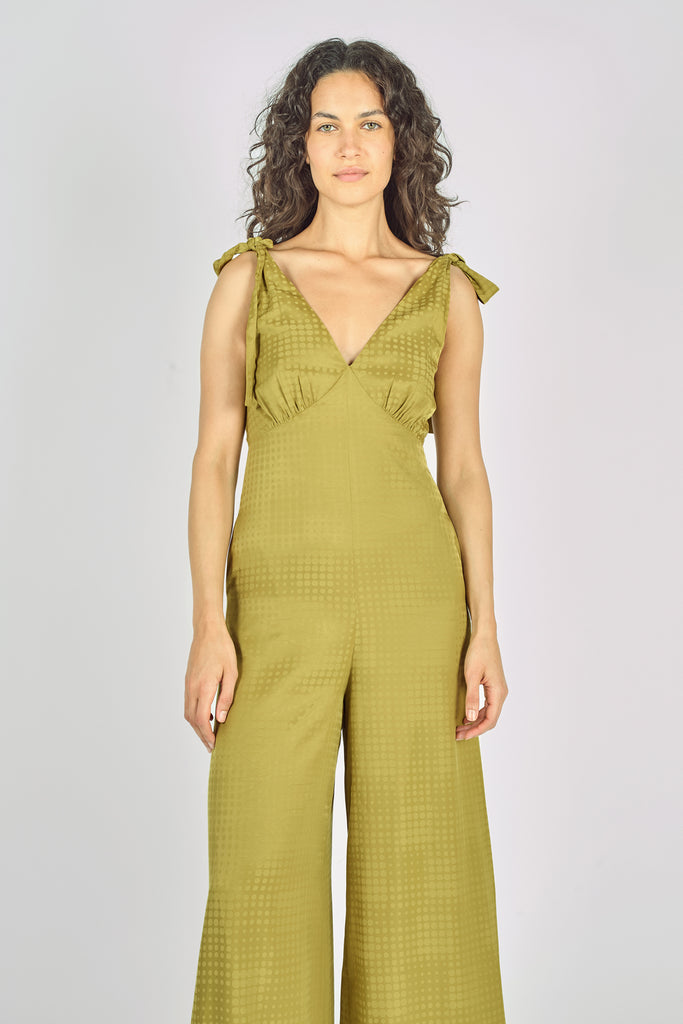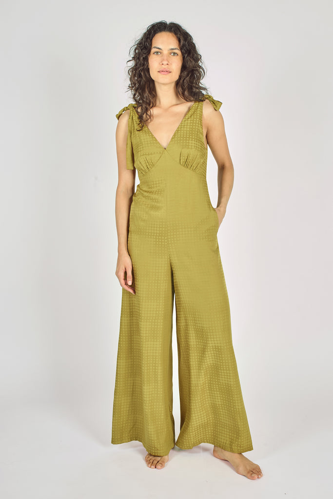 The Gracie Jumpsuit is the perfect summer staple, especially in the stunning olive shade and subtle spot print of our Circle Of Trust Fabric. Featuring a stunning wide leg fit, with gathering on the bust and tie shoulder straps. The perfect jumpsuit to dress up or down to suit all occasions.