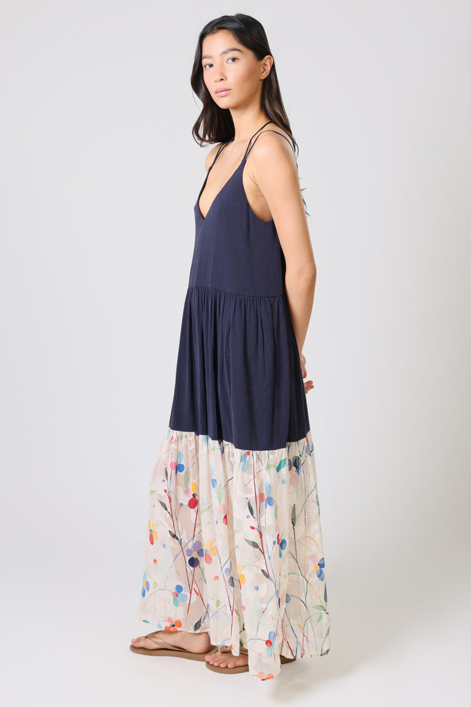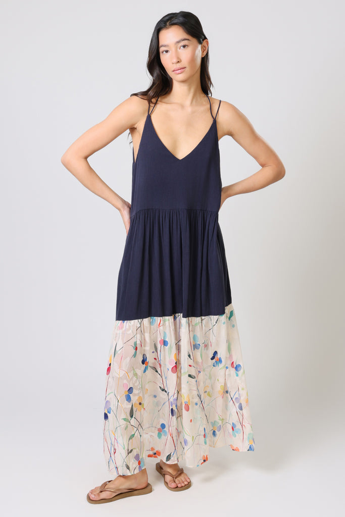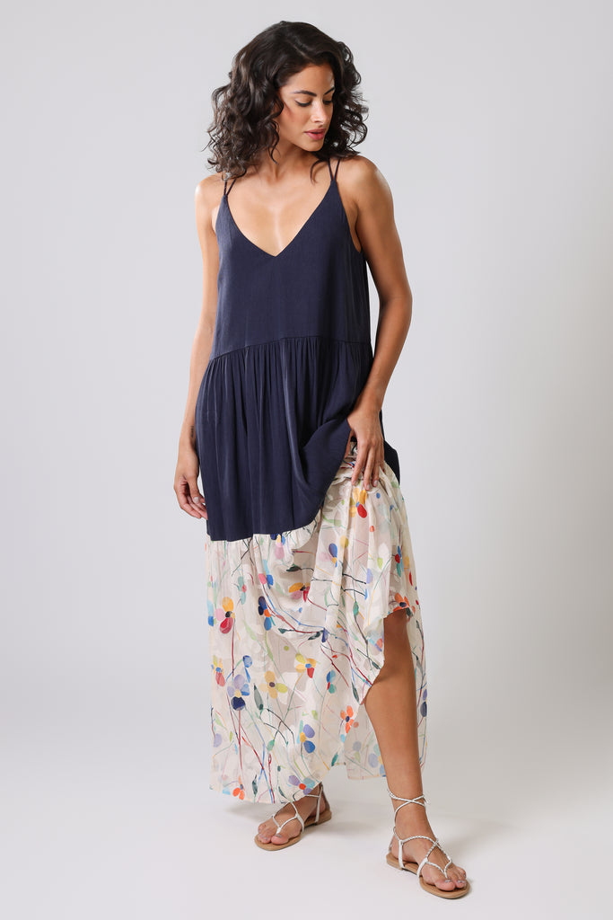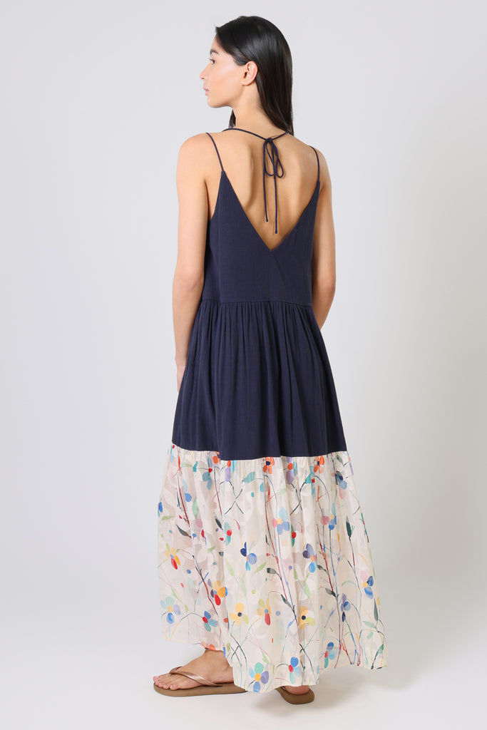 Our Ithaca Dress is sure to be your new summer staple. A beautiful sleeveless maxi sundress, with spaghetti straps which are tied at the neck, a flattering deep V-neckline, and a flattering trapeze silhouette. It's perfect for those hot summer holidays by the beach. In a simple navy blue, with a Spring-like cream pastel floral print hem to add a pop of pattern to your outfit.