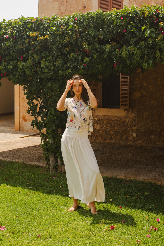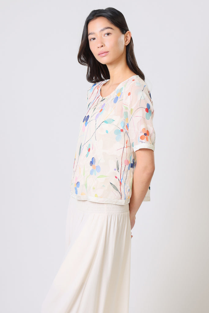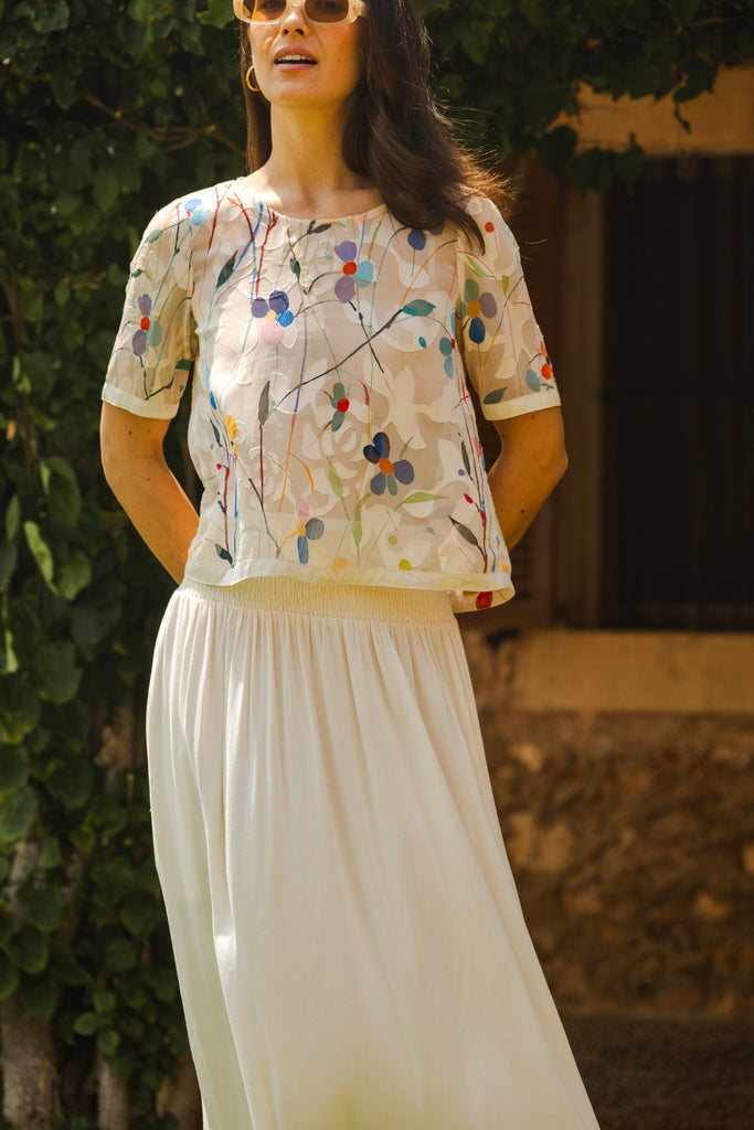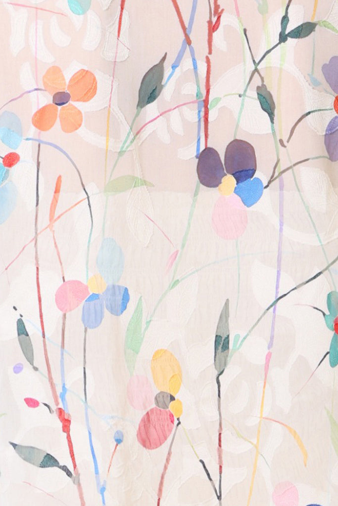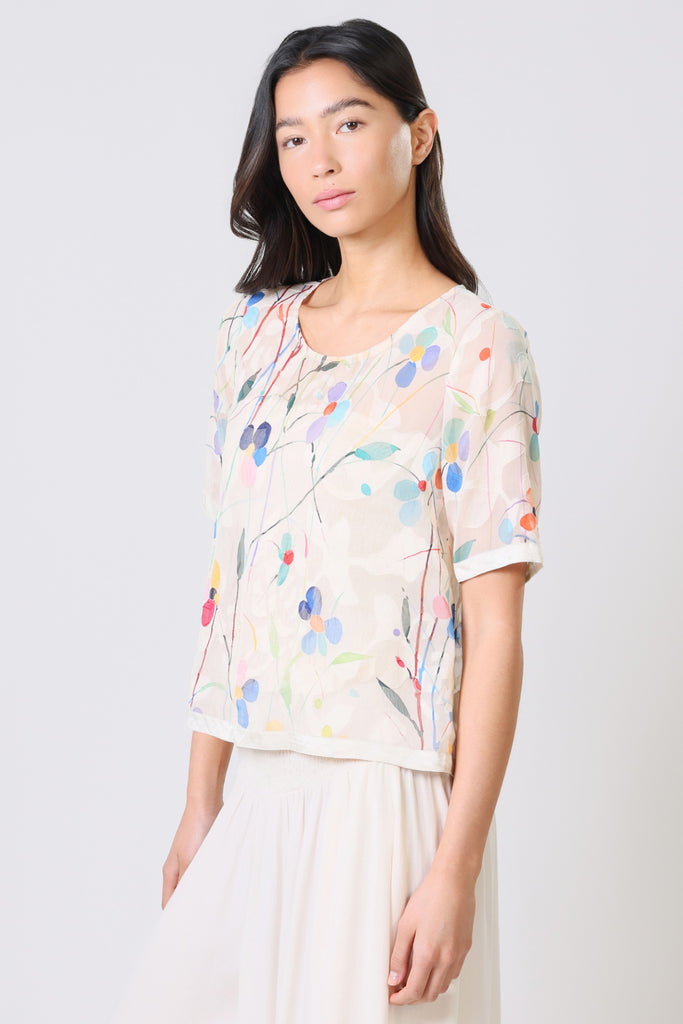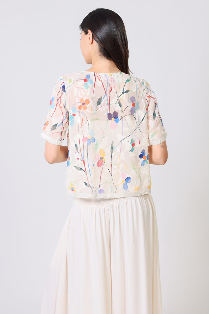 Our Sass Sheer Top is sure to be a staple in your summer wardrobe. A simple sheer loose fit top, with short sleeves that are finished with a beautiful satin trim cuff. The classic round neckline makes it all the more easy to wear. It brings the perfect Spring vibe in this white and multicolour floral print. Complete the look with our matching Aurora Skirt.