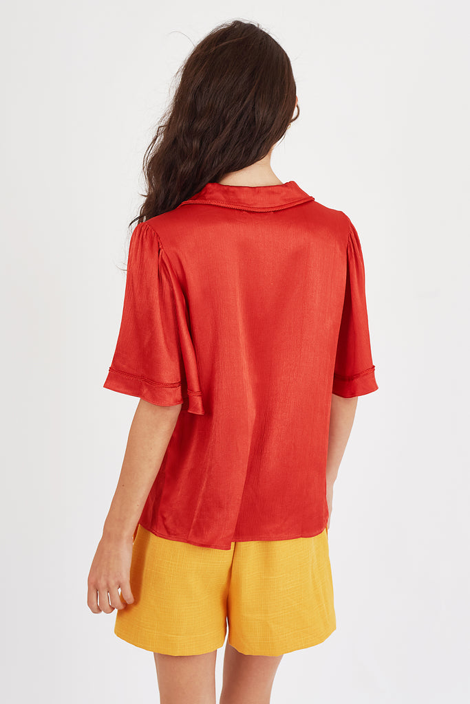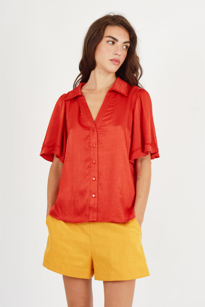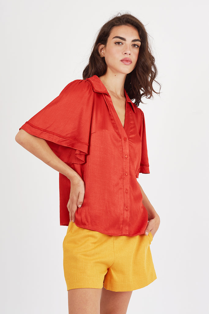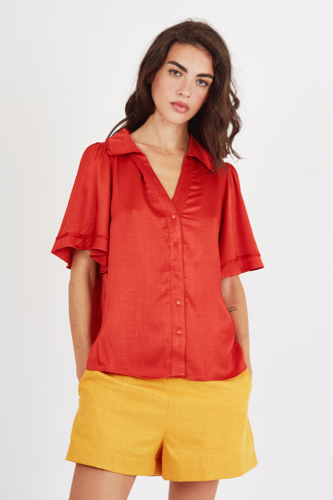 The Claude shirt is beautiful in this rust red fabric. Cut with elbow length trumpet sleeves for added flare, and a button-up V neck collar. The perfect versatile piece to add to your Spring/Summer wardrobe. 53% Tencel 47% Viscose.