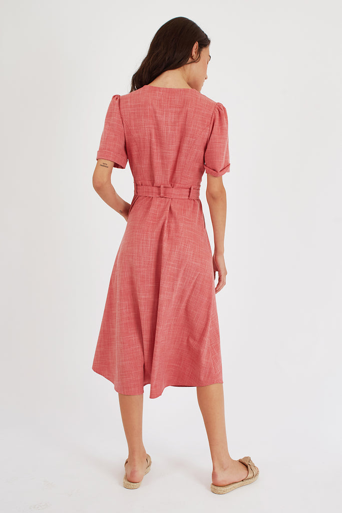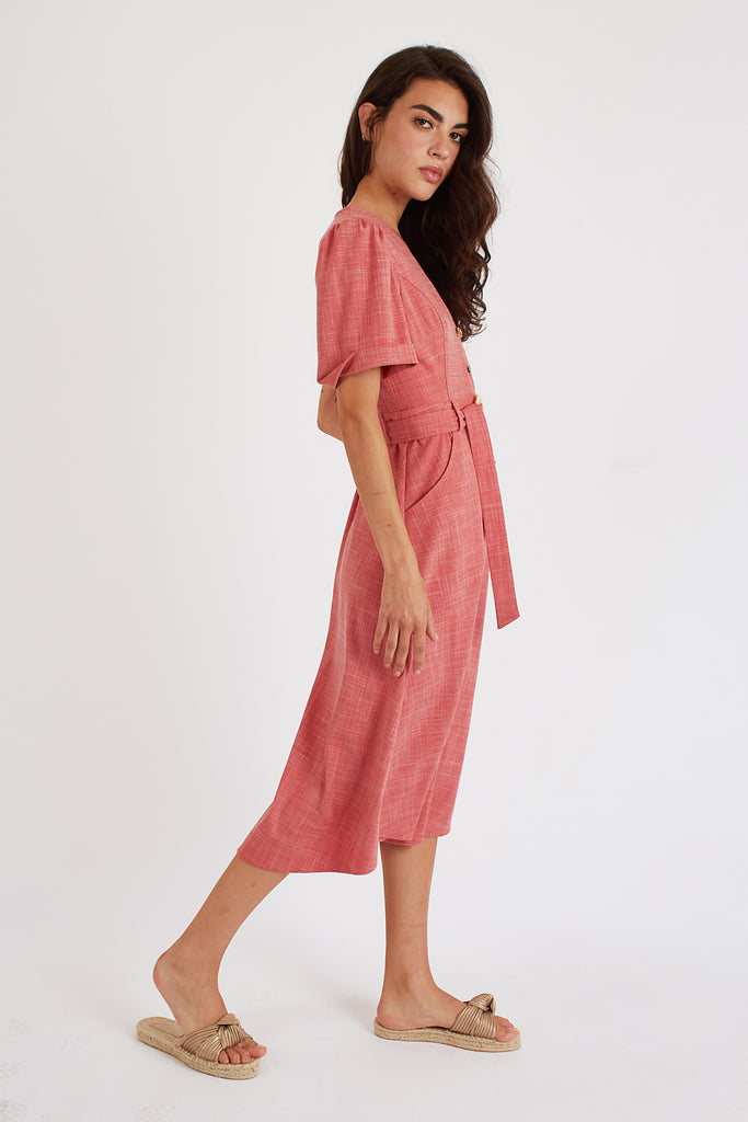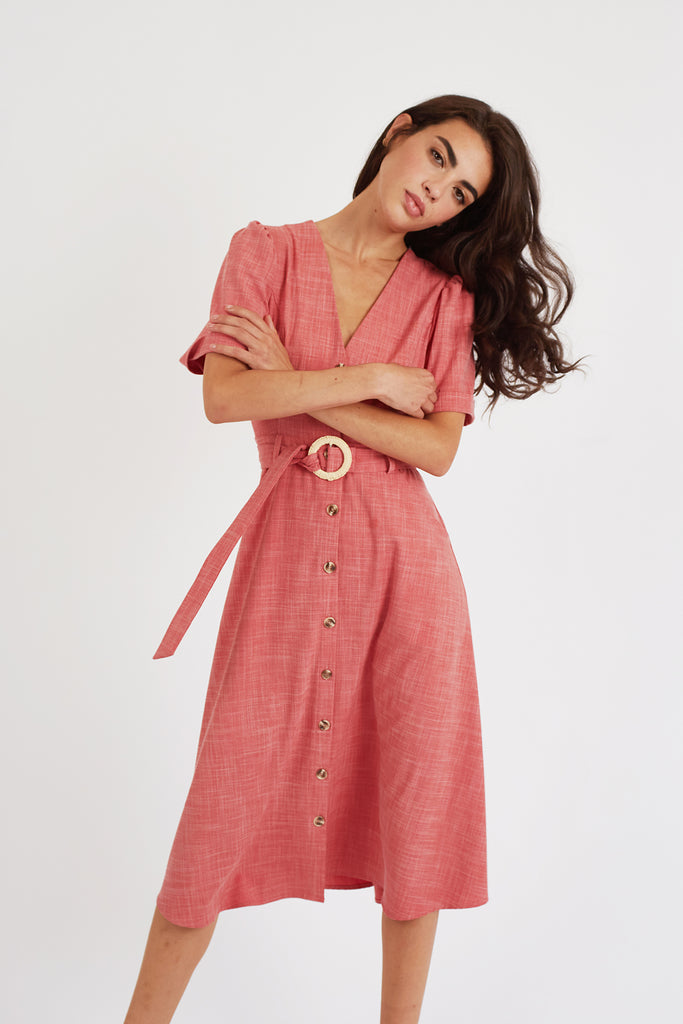 We love the casual summer vibes of the Betty dress. A simple button up front with an added belt to cinch in the waist. The perfect casual midi dress. 35% Viscose 35% Polyester 25% Nylon 5% Elastane.