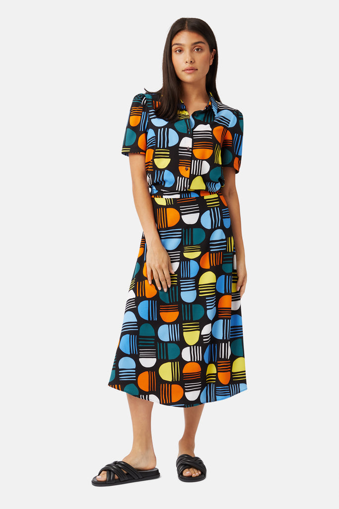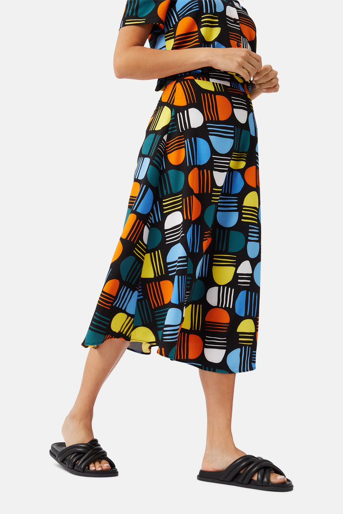 The Frenchie is a simple and chic flowing A -line skirt. It works beautifully with a casual tee or the Retro Rose top. Back zip fastening. Pair with a simple tee for the perfect casual summer outfit. Machine wash 30c. 100% viscose.