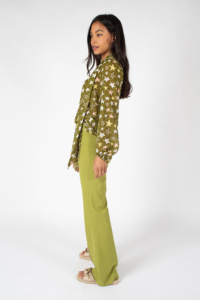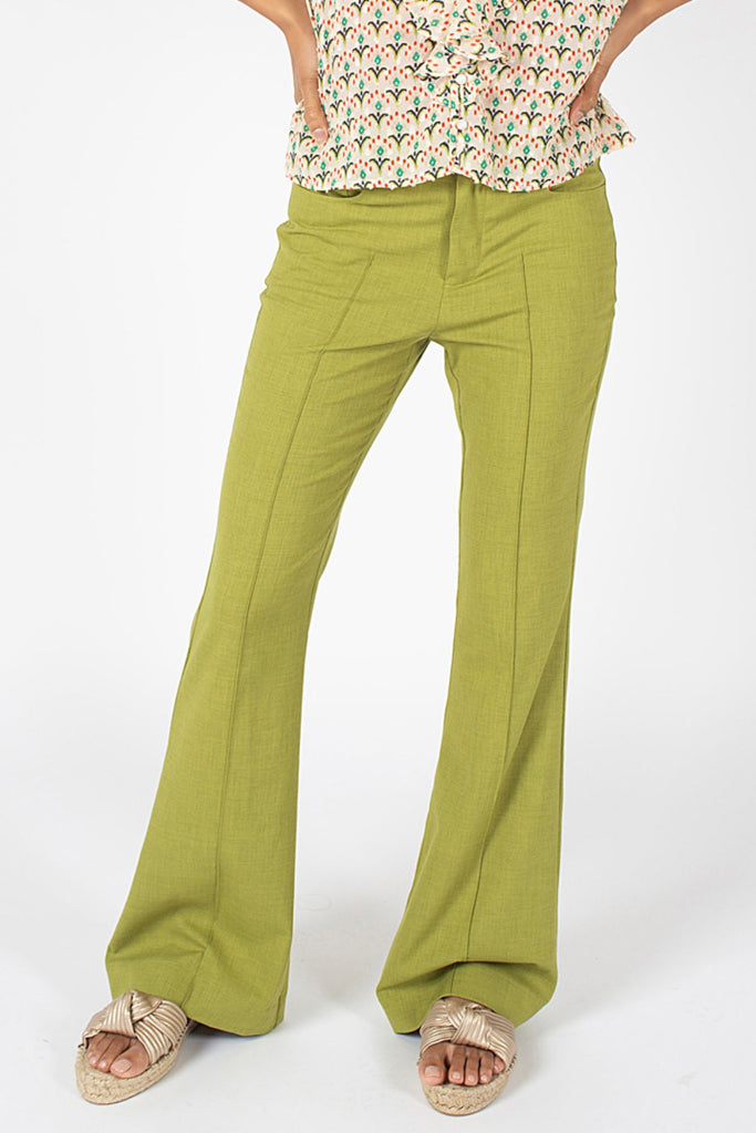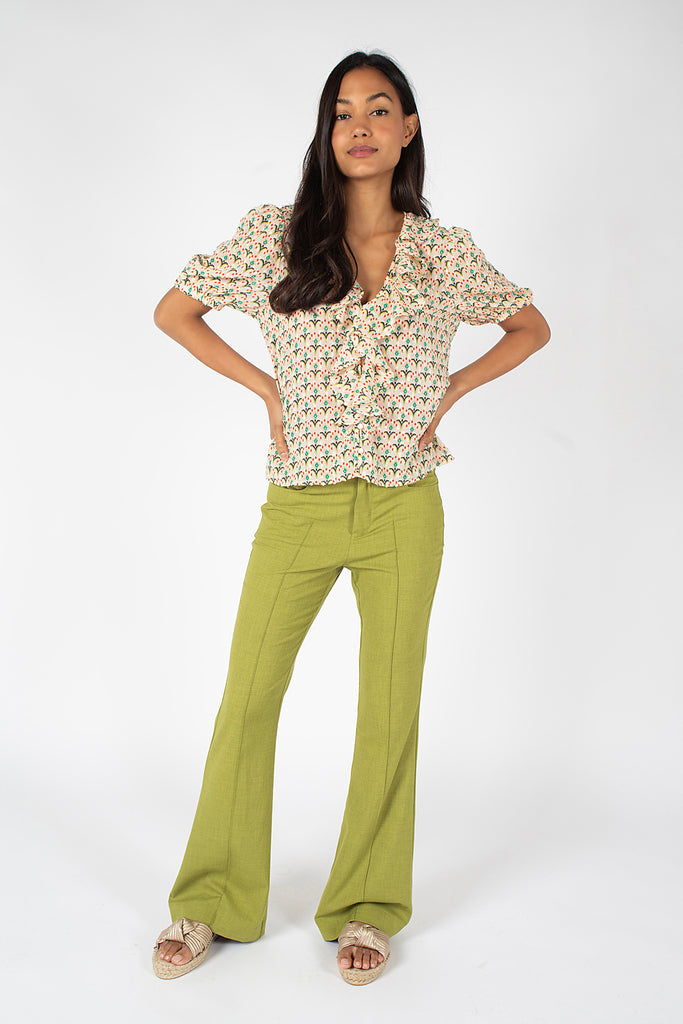 Our kick flare trousers look fabulous in the stunning green tone of our Rogue Rumours fabric. Fitted trousers with the perfect flare. Button and zip front opening. Front pockets. 35% Viscose 35% Polyester 25% Nylon 5% Elastane.