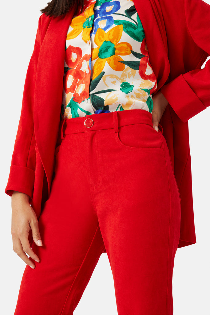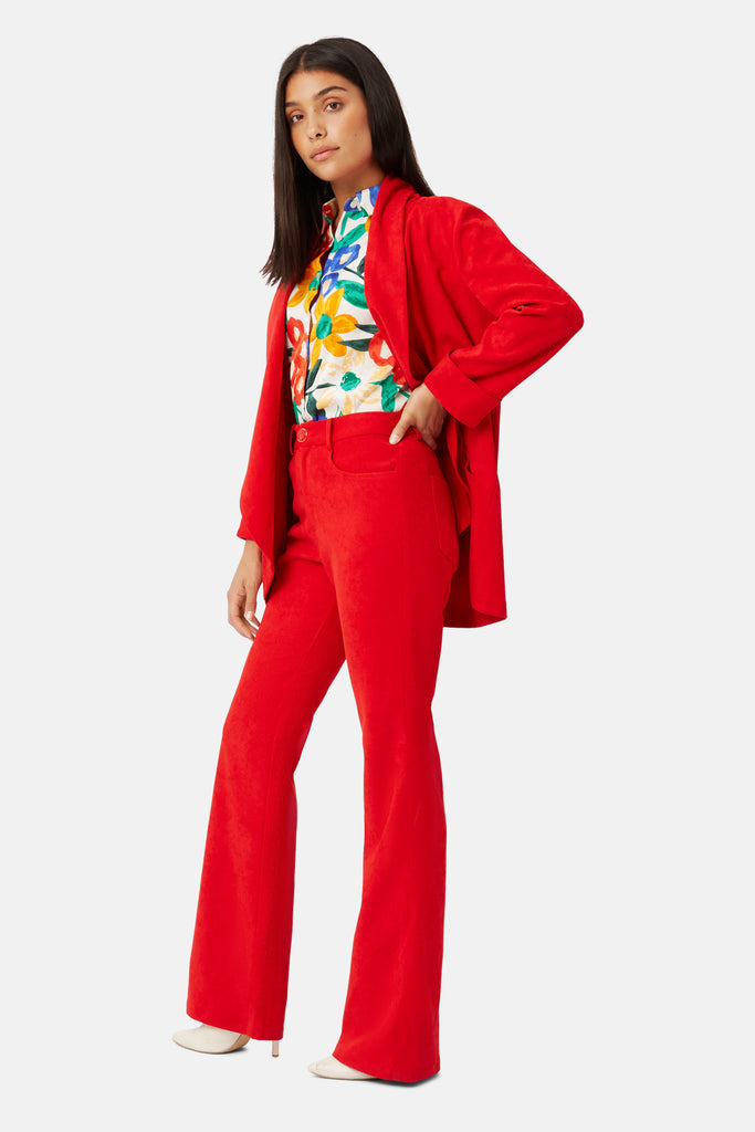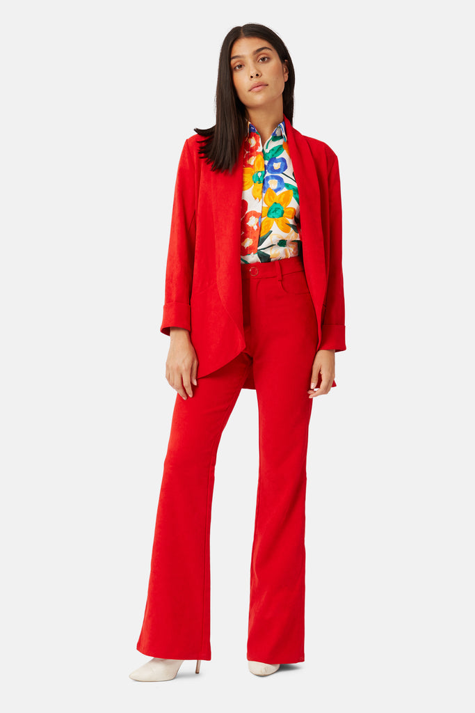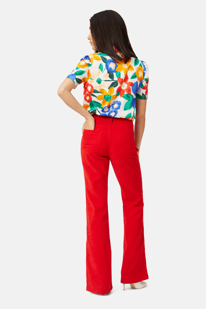 Our best selling kick flare trouser looks fabulous in the Solitude and Silence yarn. Fitted trousers with the perfect flare. Button and zip front opening. Front pockets.