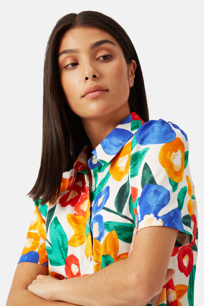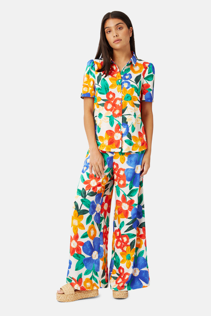 The Frenchie classic short sleeve top features a pretty shirt collar and mother-of-pearl buttons. Pair with our Sweet Bird of Youth Flare Trousers. 65% viscose 35% polyester. Machine wash 30c.