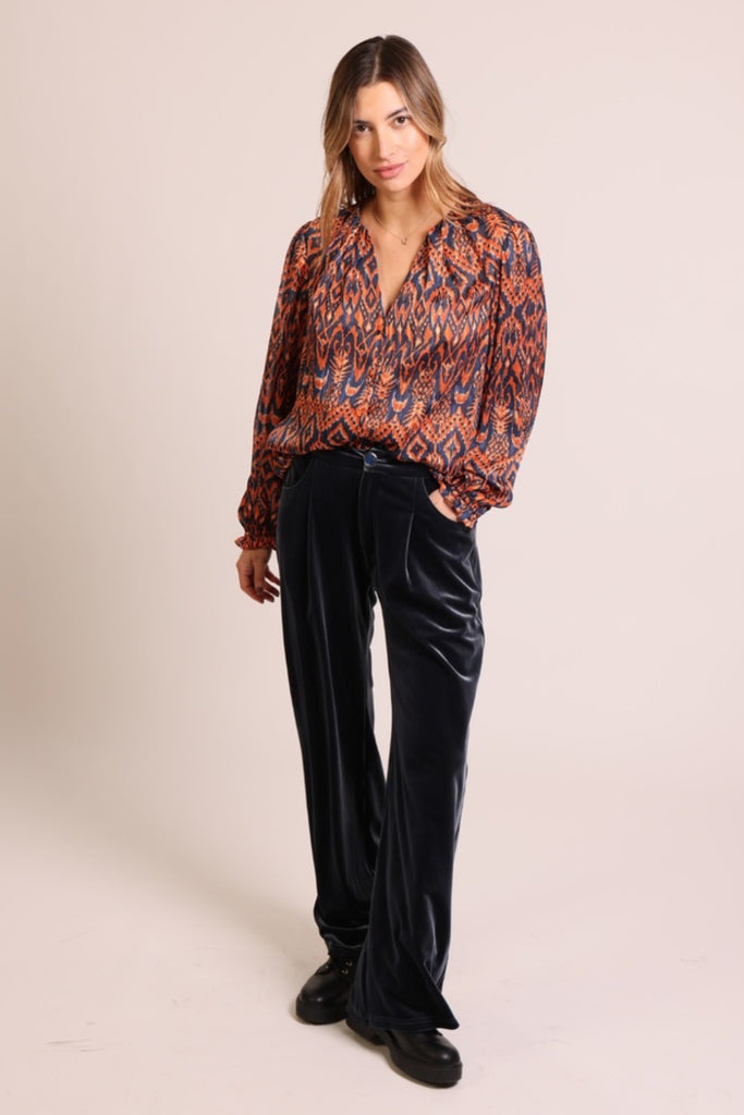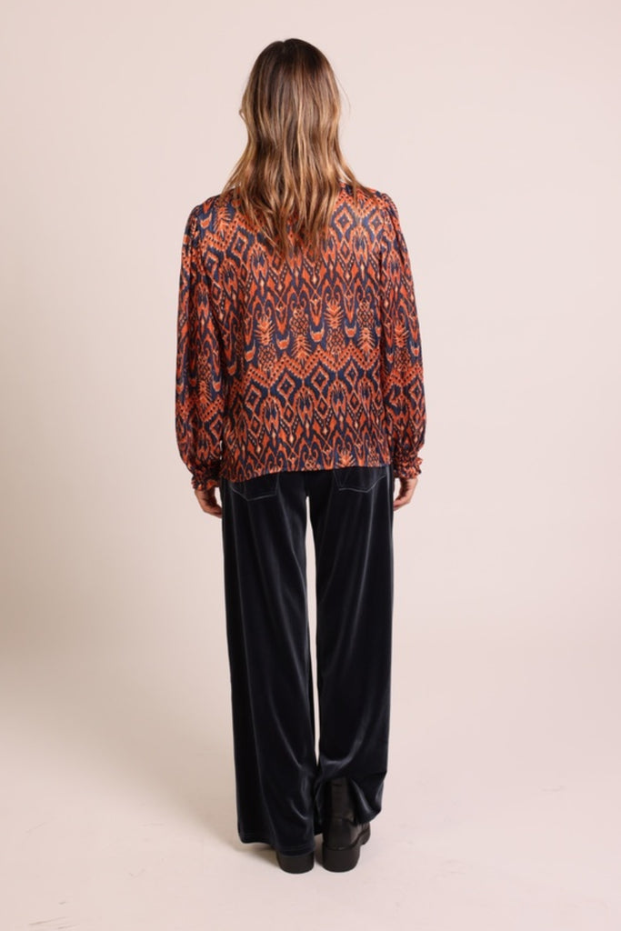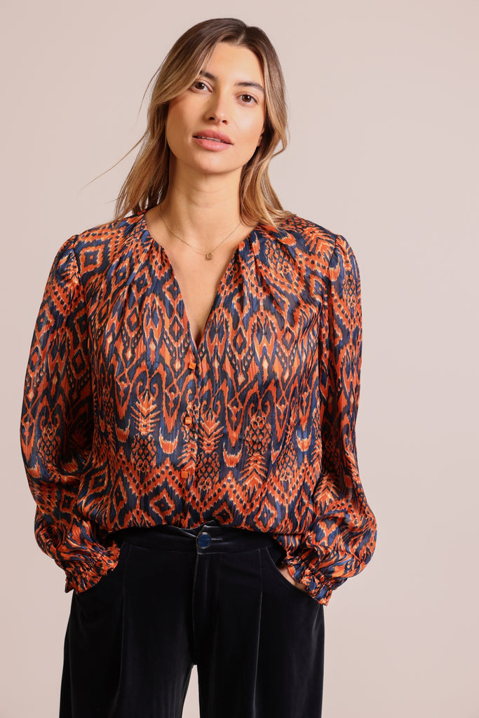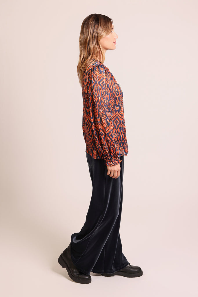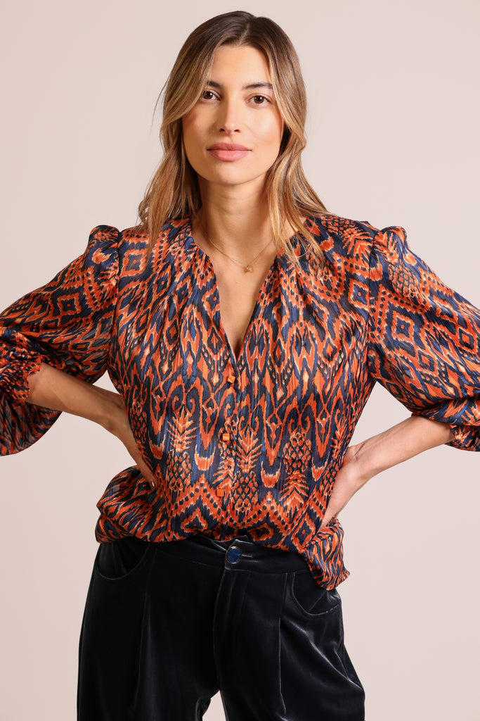 The Truce shirt is a classic chiffon shirt, with a V-neck and soft gathering at the neckline. The loose sleeves are finished with an elasticated frill cuff, giving the shirt a beautifully relaxed silhouette. So unique in this bold orange and blue print fabric. Unlined. Models are wearing with our Corrie Bratter Ceeci Trousers.