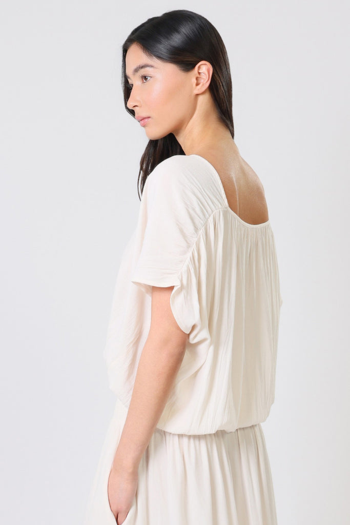 The Whispers Top gives the perfect casual summer boho vibe. A lightweight white women's top, with short sleeves, a V-neckline and a deep cut back. The elasticated waist creates a relaxed and comfortable silhouette. It pairs perfectly with our matching Aurora Wide Leg Trousers or Aurora Skirt to create the perfect boho summer outfit.