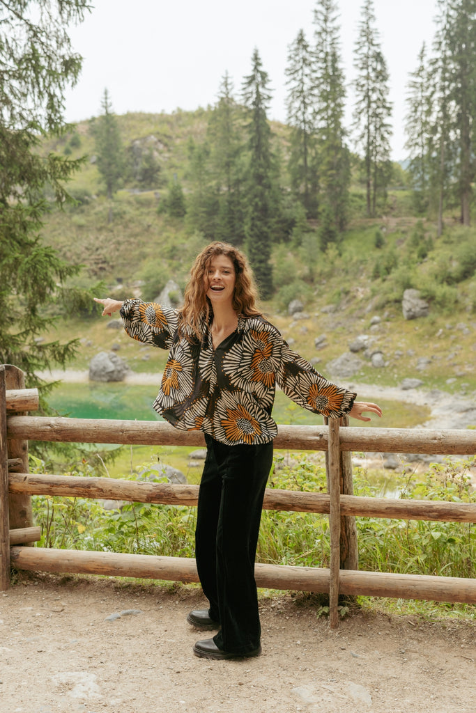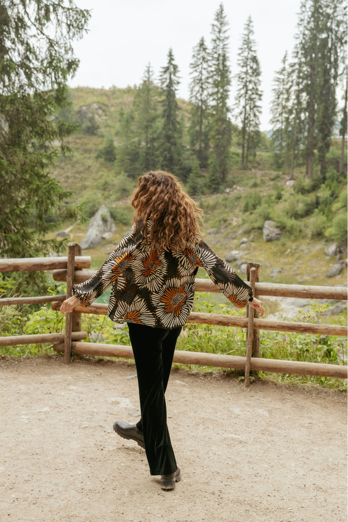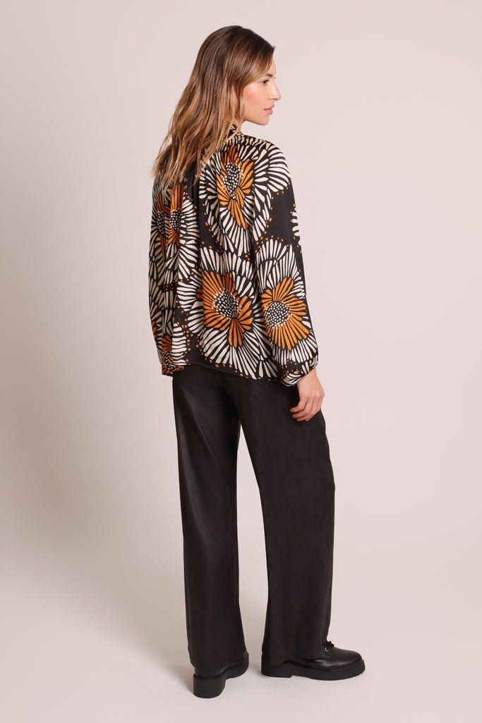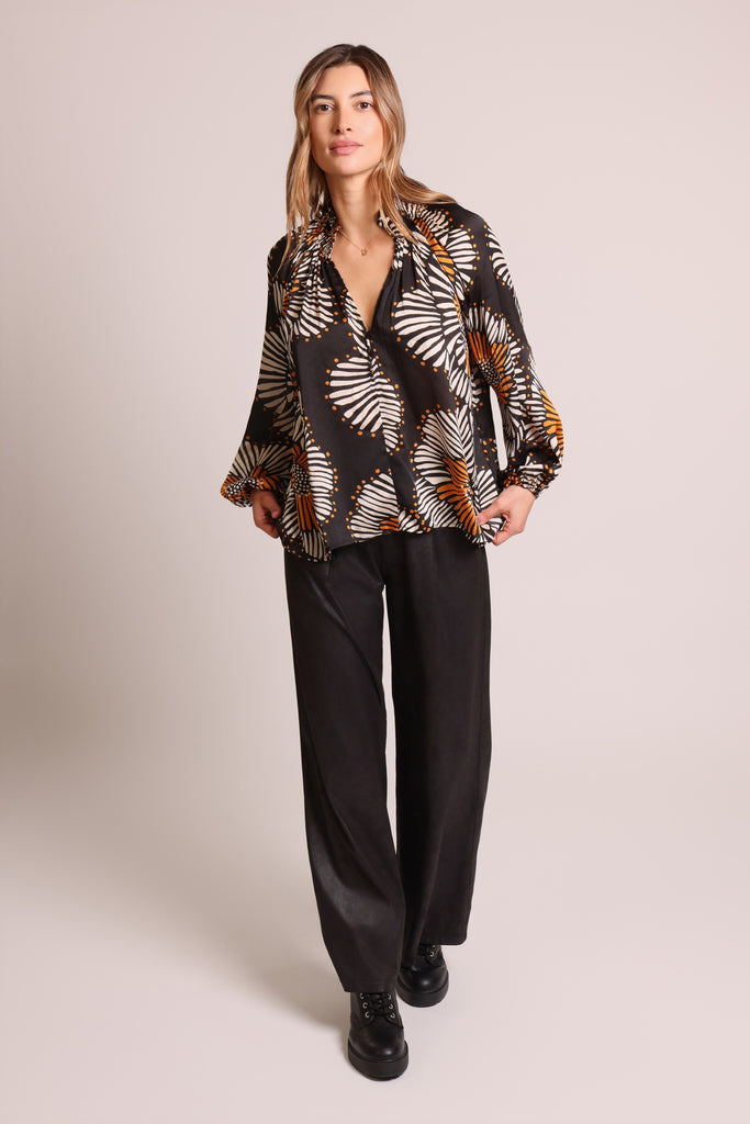 The Madding shirt is stunning in this black white and orange floral style print. Dress it up or down - either way you're good to go. It's a flattering loose fit blouse, with a V-neck and a smocked detail on the collar. A great easy-to-style piece to add to your Autumn wardrobe.