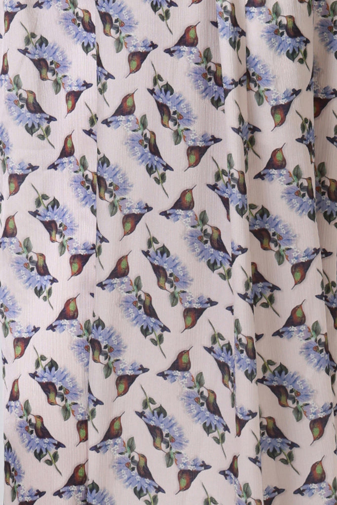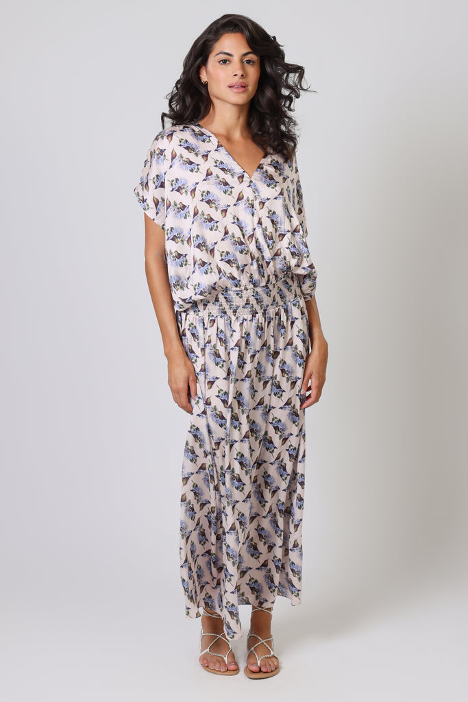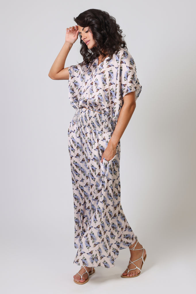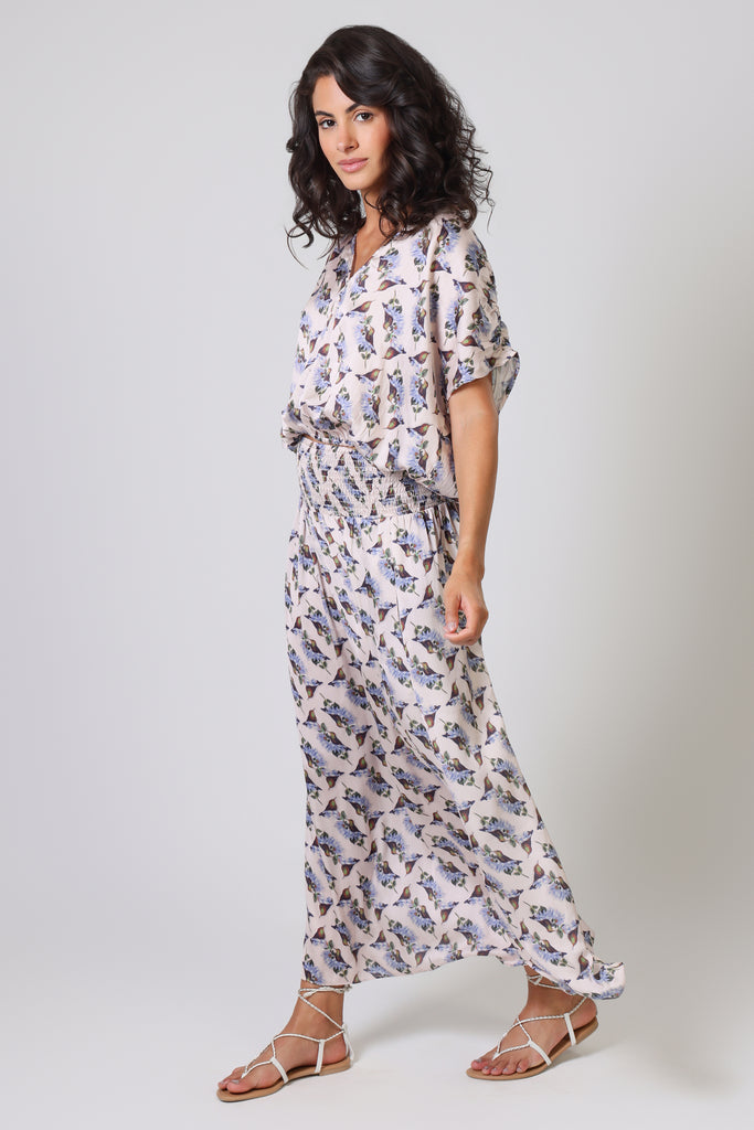 The Whispers Top is a beautiful loose fit V-neck women's top. The low drop cap short sleeves and elasticated hem create a flattering and chic boho style silhouette. It has the most perfect Spring vibes in this white and blue bird floral print fabric. Finish the look with our matching Aurora Skirt for the full summer outfit, perfect for a summer holiday.
