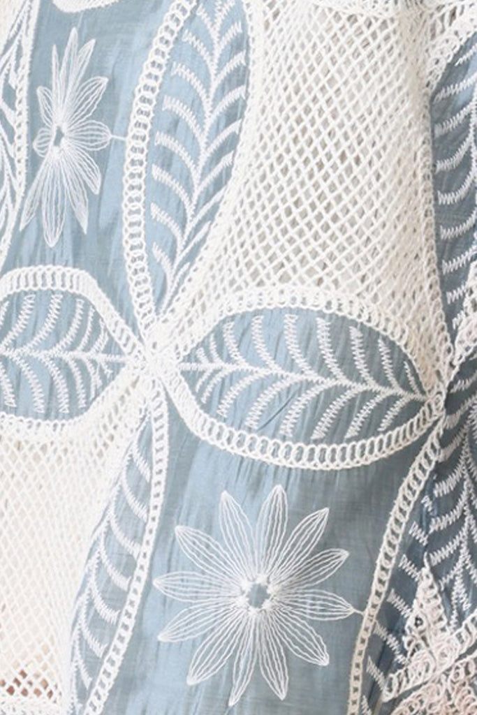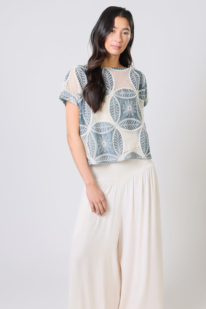 Our Briefest of Moments Carrie top is the perfect layering piece for your summer wardrobe. A lightweight, cotton women's top with shorts sleeves and a high boat neckline. It gives a beautiful summer vibe in this light blue and white embroidered mesh cotton fabric. Perfect for those holidays by the beach.