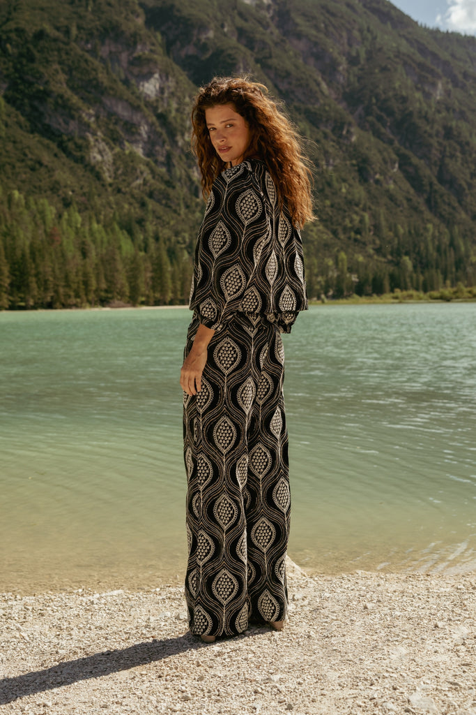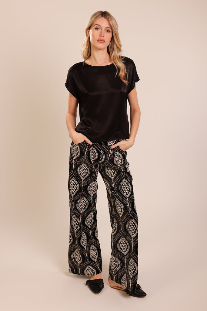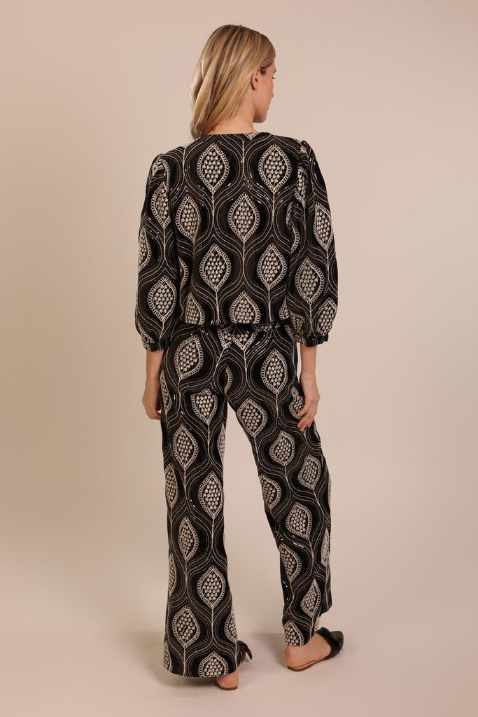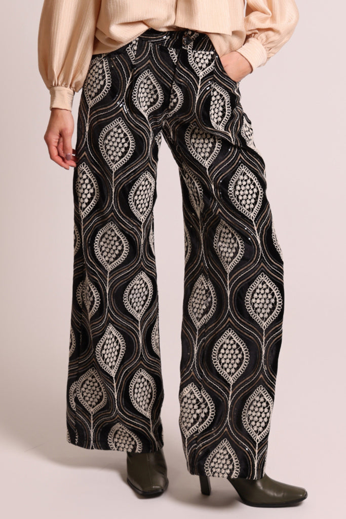 Add a subtle hint of sparkle to your winter wardrobe with our Love and Anarchy Lulu Trousers. Relaxed and wide leg high rise trousers, which have a loose fit around the hip and thigh. They look stunning in this black and white embroidered and sequined cotton fabric. Why not pair with our matching Paddle Jacket or Duster Coat for a stunning festive party outfit.