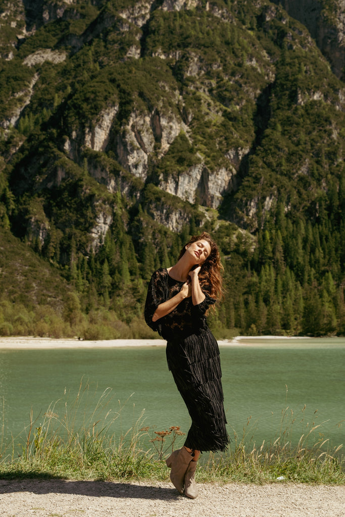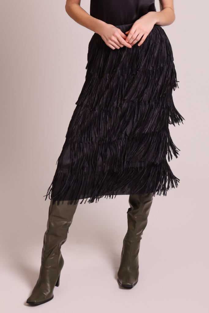 Add a touch of Flapper energy to your wardrobe with our Gloria skirt. A beautiful black tiered fringe midi skirt, with a stretch waistband for added comfort. Style with a black top and some knee high boots or heels for a stunning winter party outfit. Models are wearing with our The Great Silence Bloom Blouse and Nobody Asked Grace Top.