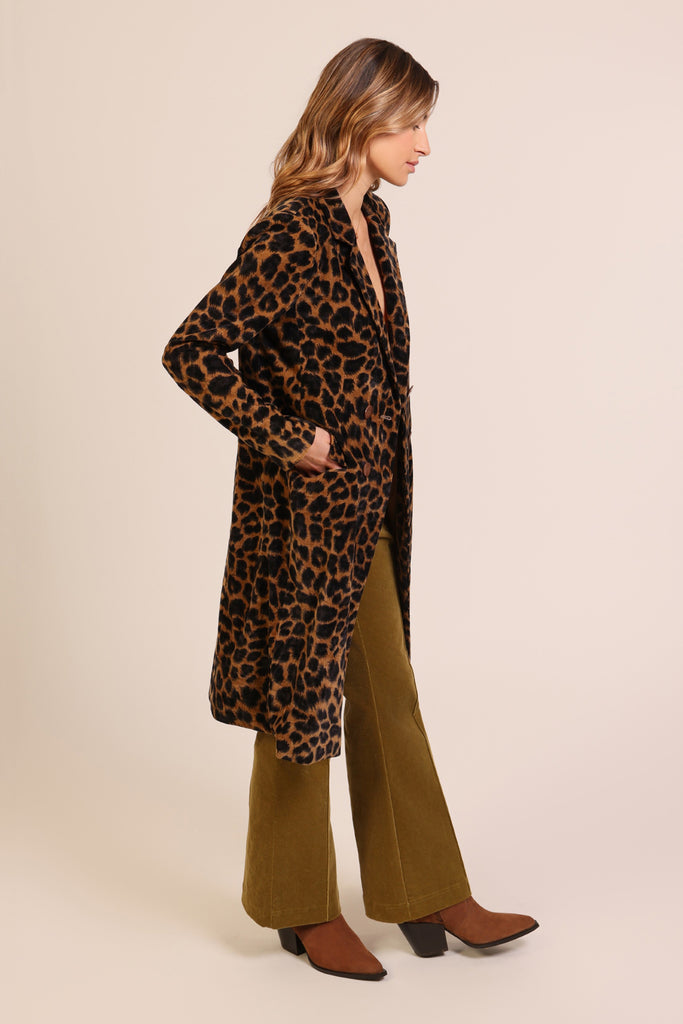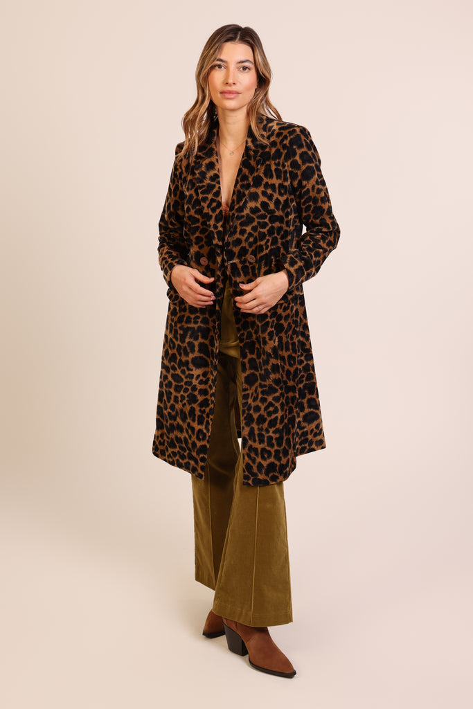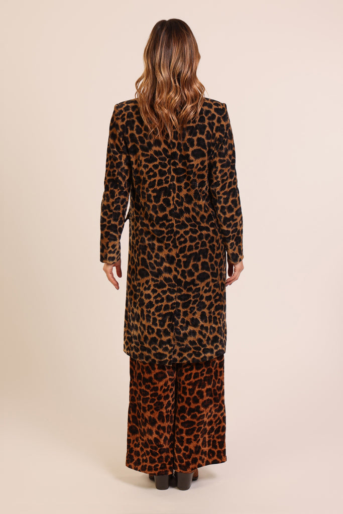 Complete your winter wardrobe with our Proceed with Caution Anarchy Coat. A classic lapel neck double breasted coat, at a flattering knee length. Finished with pockets. It looks stunning in this bold brown and black leopard print. Just pair with our matching Jilly Trousers for the full winter outfit. Model is wearing with and our The Gateway Ceeci Trousers and Proceed With Caution Lulu Trousers.