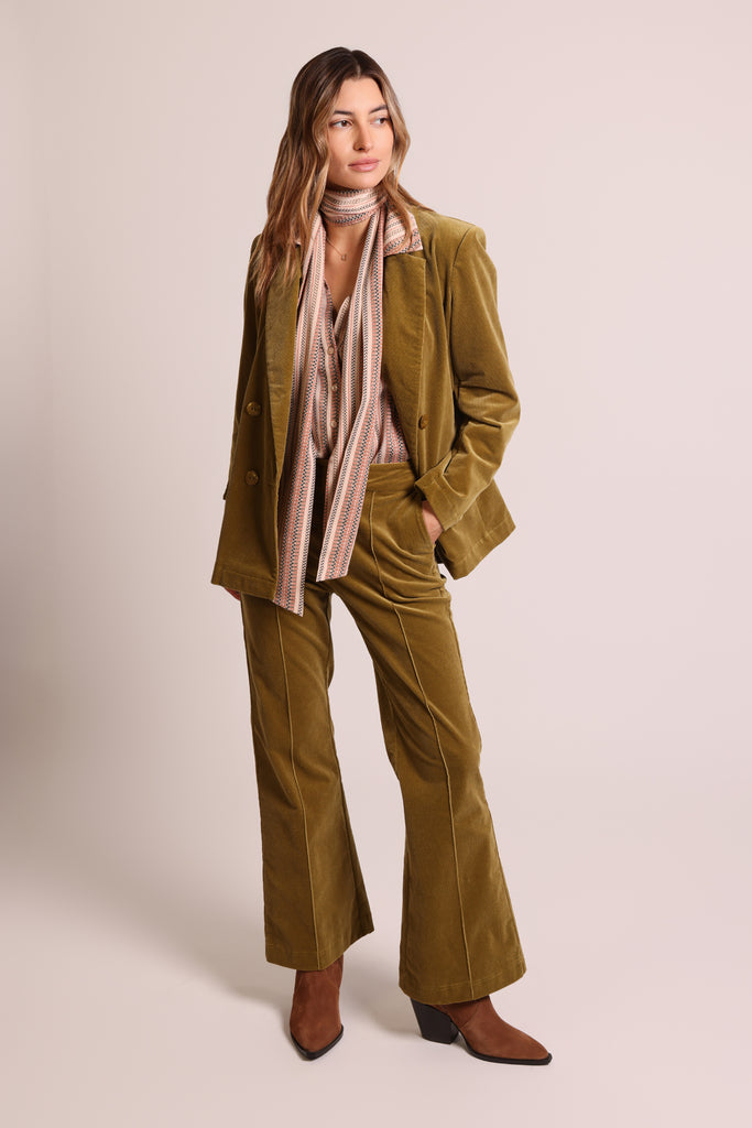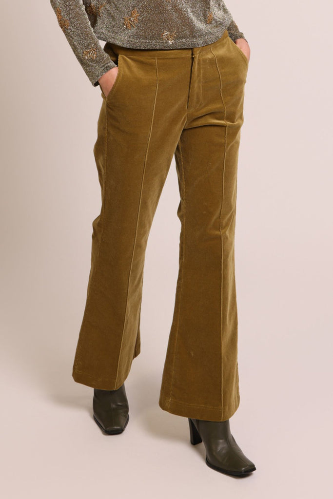 The Ceeci trousers are sure to be a winter staple. They have a mid-rise fit and descend into a flattering soft flare. Fastened with a concealed front zip and clasp closure. They feel luxuriously soft in this olive green cotton blend. Just pair with our matching Ava Rose Jacket for the full winter outfit. Perfect for work or a festive party. Model is wearing with our Burnout Bloom Blouse.