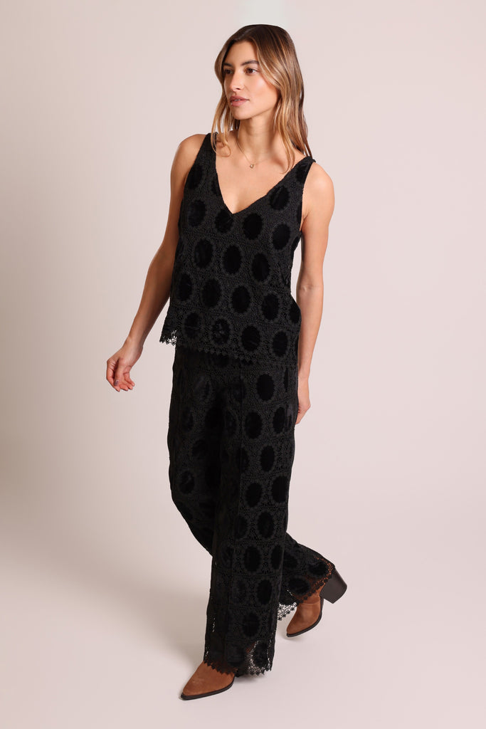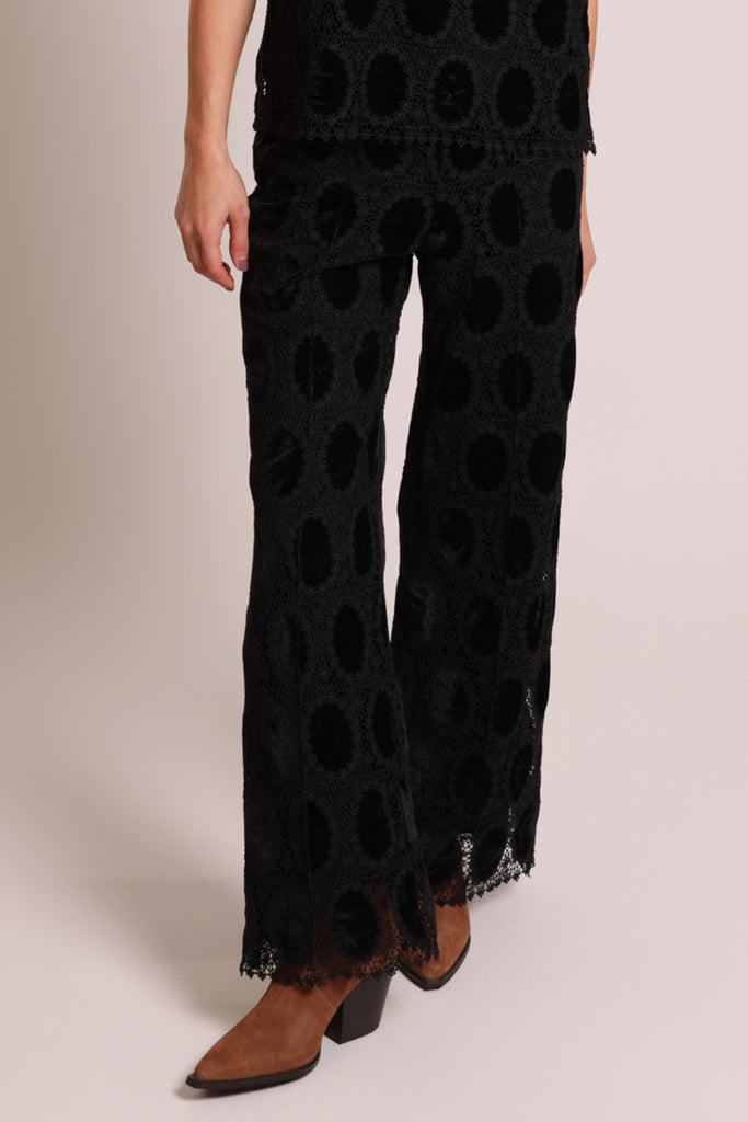 Our Evie trousers are back with the most comfortable wide leg fit. Featuring a flat front mid-rise waistband with elastic in the back to allow for a more comfortable fit. They have the essential side pockets and are finished with a side zip fastening. So stunning in this black crochet style fabric. Perfect for dressing up for a festive party, or down for a more casual work outfit. Pair with our matching The Great Silence Bloom Blouse.