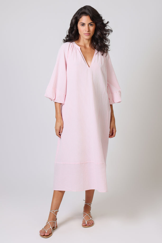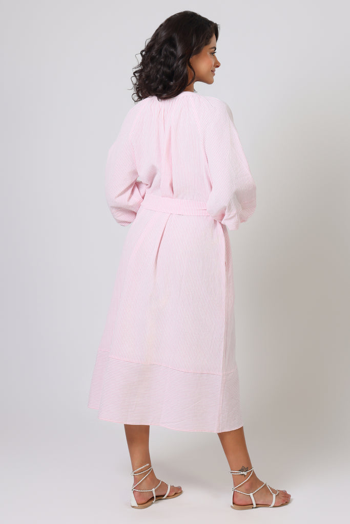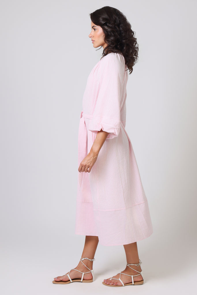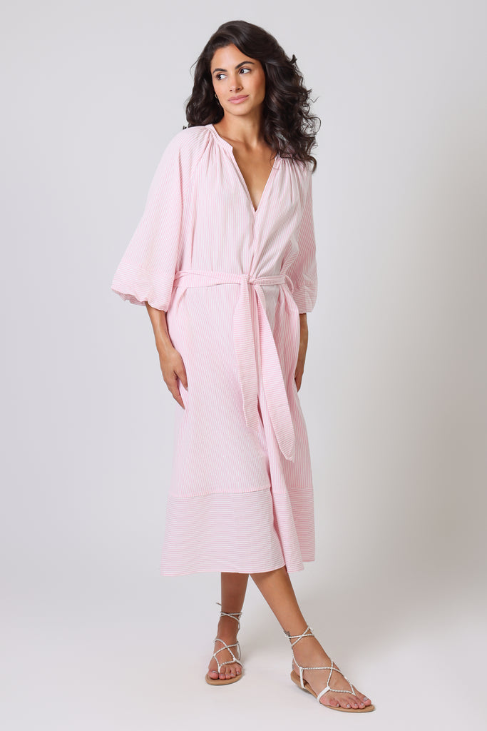 The Glee Dress has a perfect casual summer vibe in this pastel pink and white stripe, which makes it so easy to wear. With long balloon sleeves and a loose midi dress fit, it has a beautifully relaxed style which is sure to suit anyone. It comes with a belt which can be tied to cinch in the waist for a flattering silhouette. The ruched V-neckline gives the most beautiful texture to the dress.