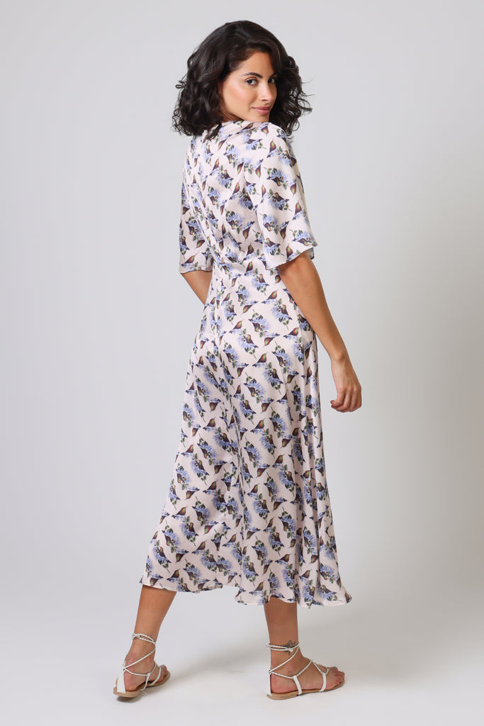 The Blythe Dress looks stunning in this white and blue bird floral print, which brings the perfect touch of Spring. A gorgeous deep V-neck midi dress, with flattering gathering on the bust and mid length trumpet sleeves which float beautifully in the breeze. Fastened with a back zip. A perfectly versatile outfit which can be dressed up or down to suit any occasion.