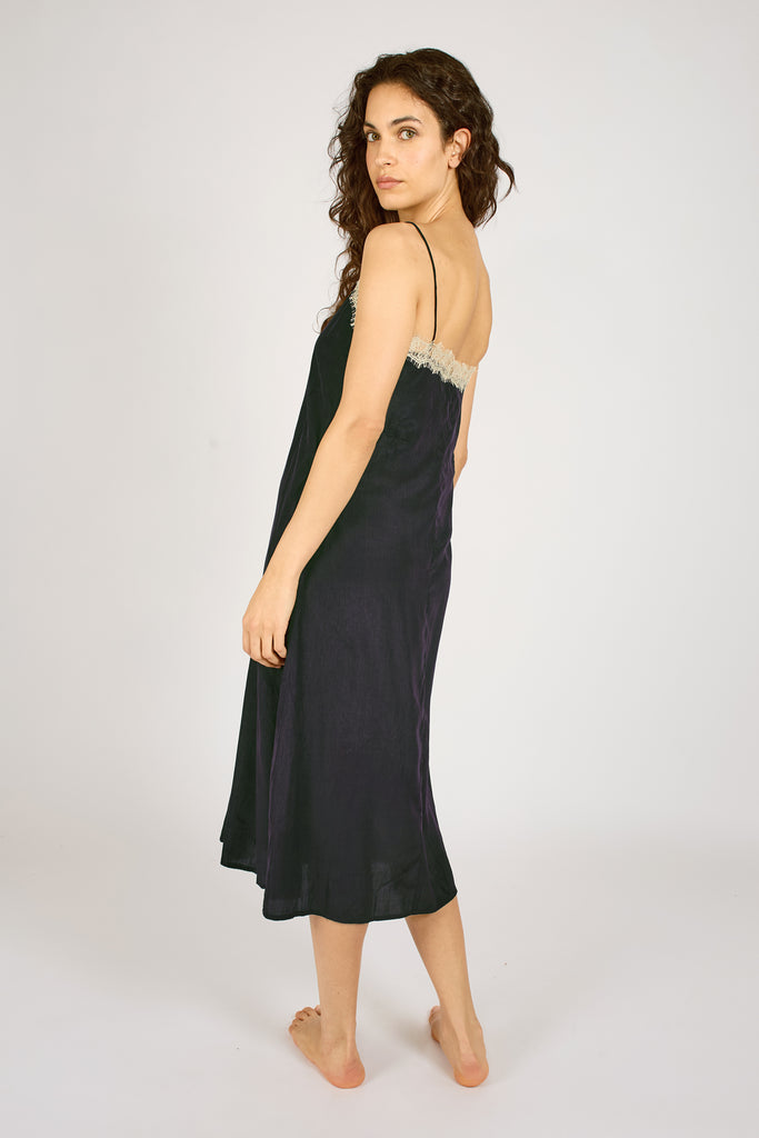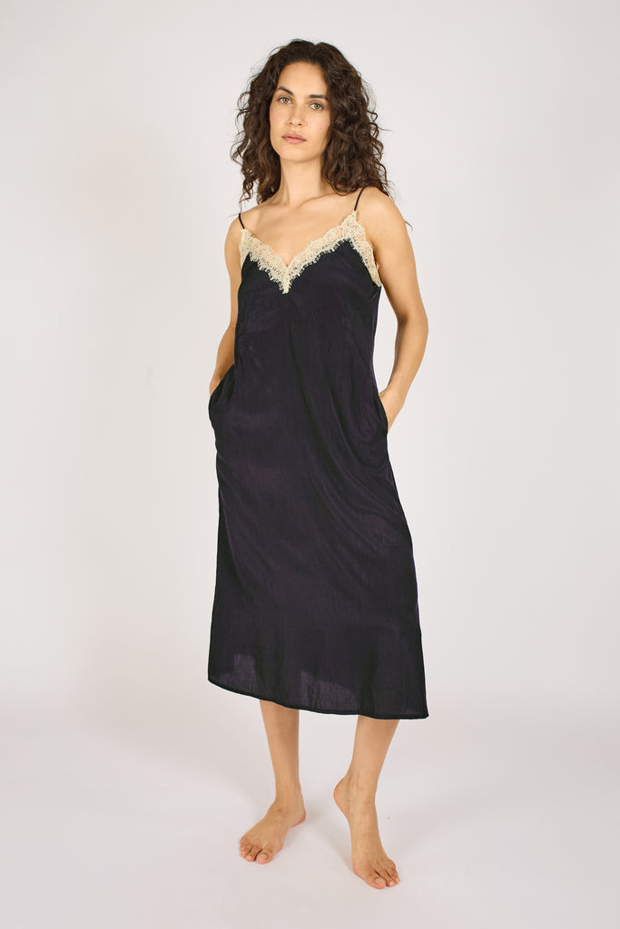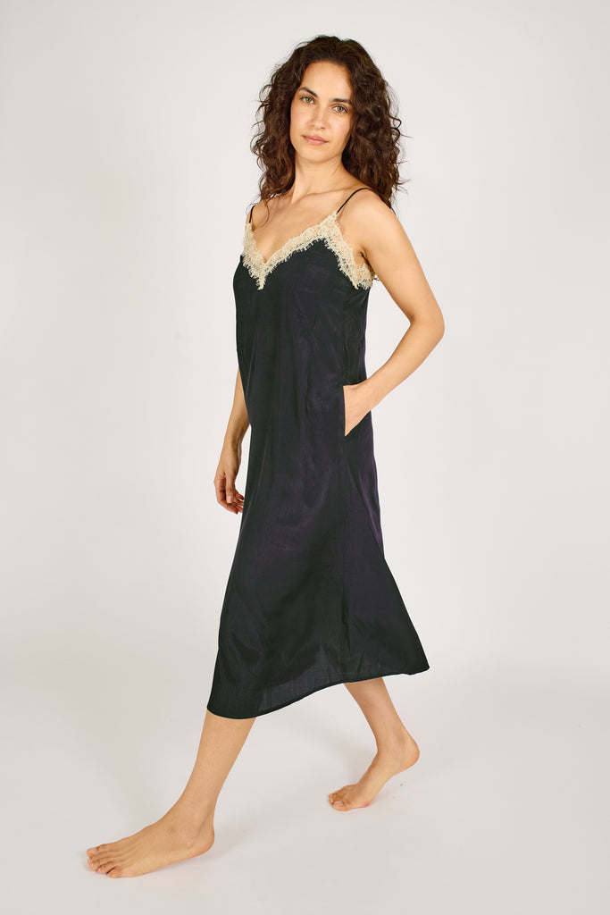 The Drew Slip is a simple shift style petticoat dress, with side pockets and a lovely cream lace trim. So easy to style in this dark navy blue silky soft fabric.