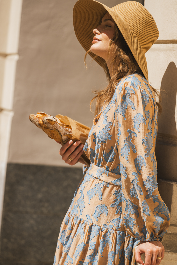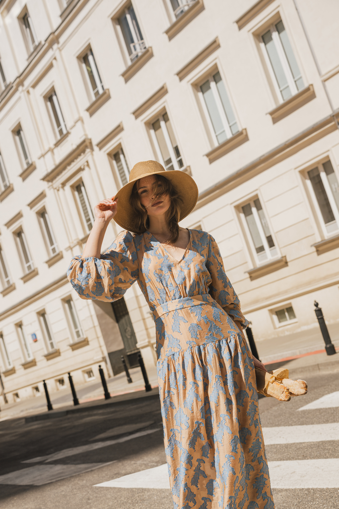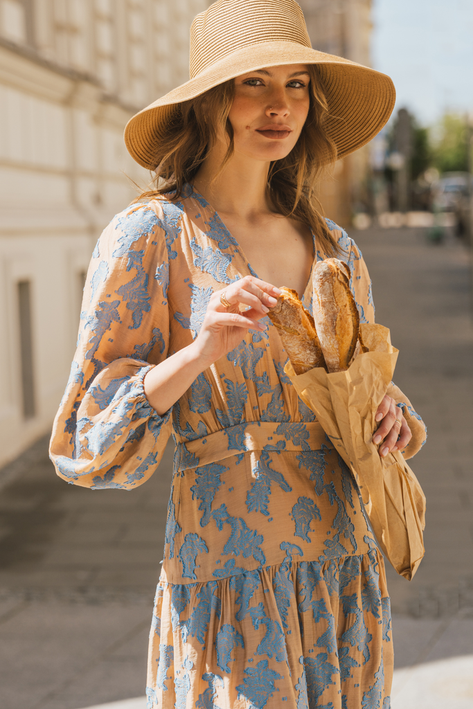 The Symi dress is a gorgeous tiered hem chiffon maxi dress, with a loose fit top, voluminous skirt, and long billow sleeves with elasticated cuffs. So unique in this brown and blue floral embellished print. Easy to dress up with heels for a beautiful summer party outfit.