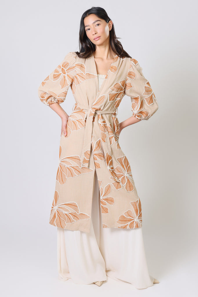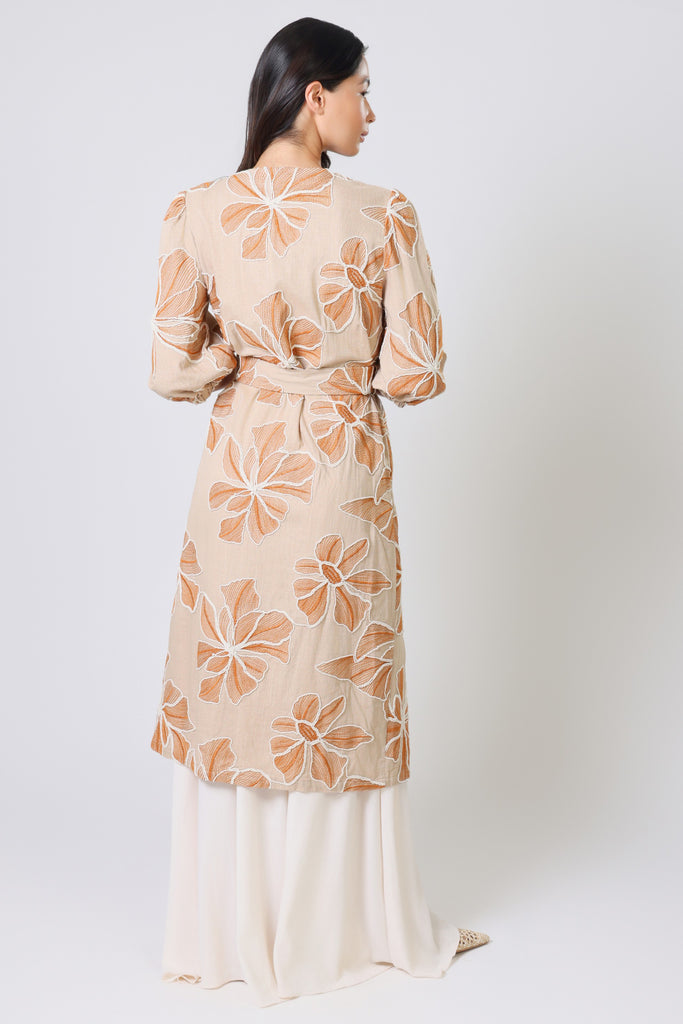 The Duster Dress Coat is a stunning piece to add to your Spring wardrobe, in this gorgeous brown, orange and white floral embroidered linen. Featuring 3/4 puff sleeves with elasticated cuffs, and a simple belt fastening. Perfect for layering to create a stunning Spring outfit to suit any occasion, especially when paired with our matching Rene Trousers or Valerie Dress.