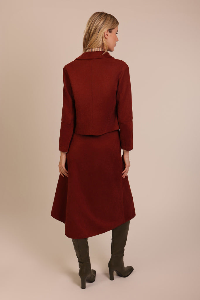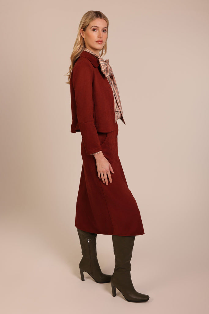 Sure to be a winter staple, the Daisy Jacket comes in a flattering cropped length with a chic box style fit. It has the classic jacket details of a button front fastening and a lapel collar, but is elevated by the luxurious touch of this soft suede blend in a beautiful wine red.