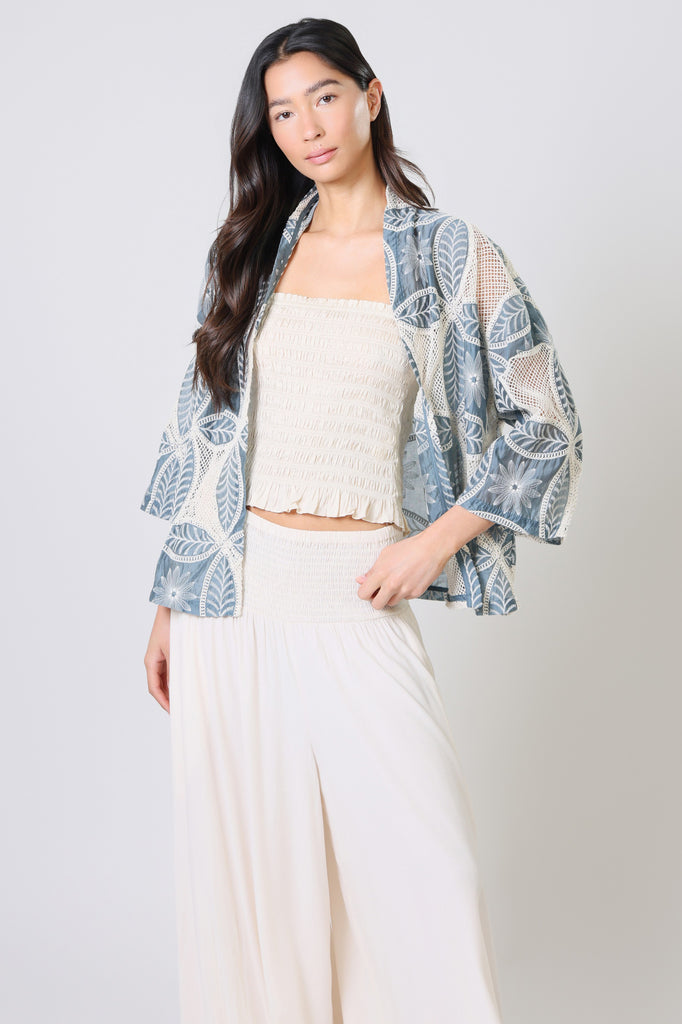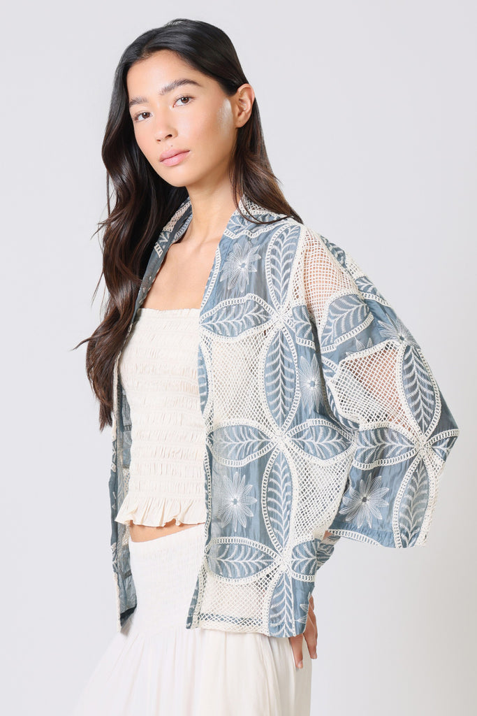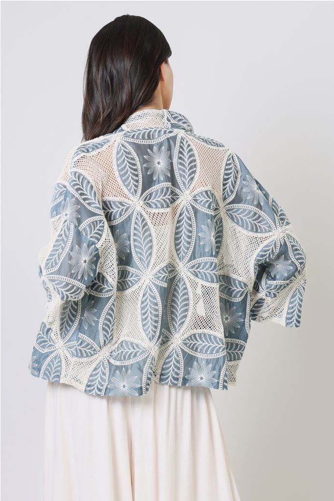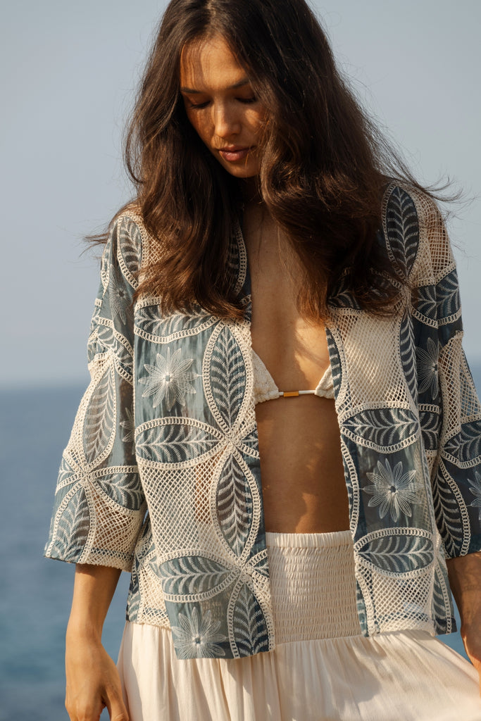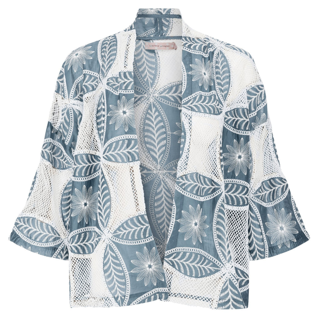Our Claude Shrug is perfect for layering over any outfit. In a stunning lightweight blue and white floral embroidered cotton, it's so comfortable for those summer evenings by the beach. With long 3/4 length sleeves and relaxed loose fit. The mesh cut-outs make it easy for the breeze to flow through, keeping you covered but still cool on those warmer summer days.