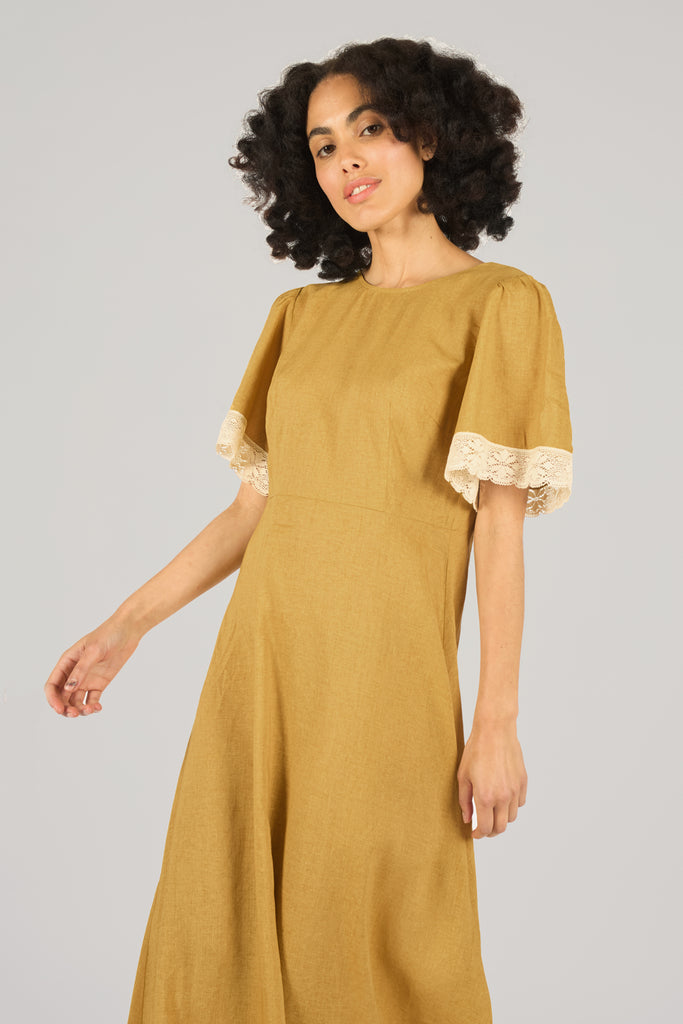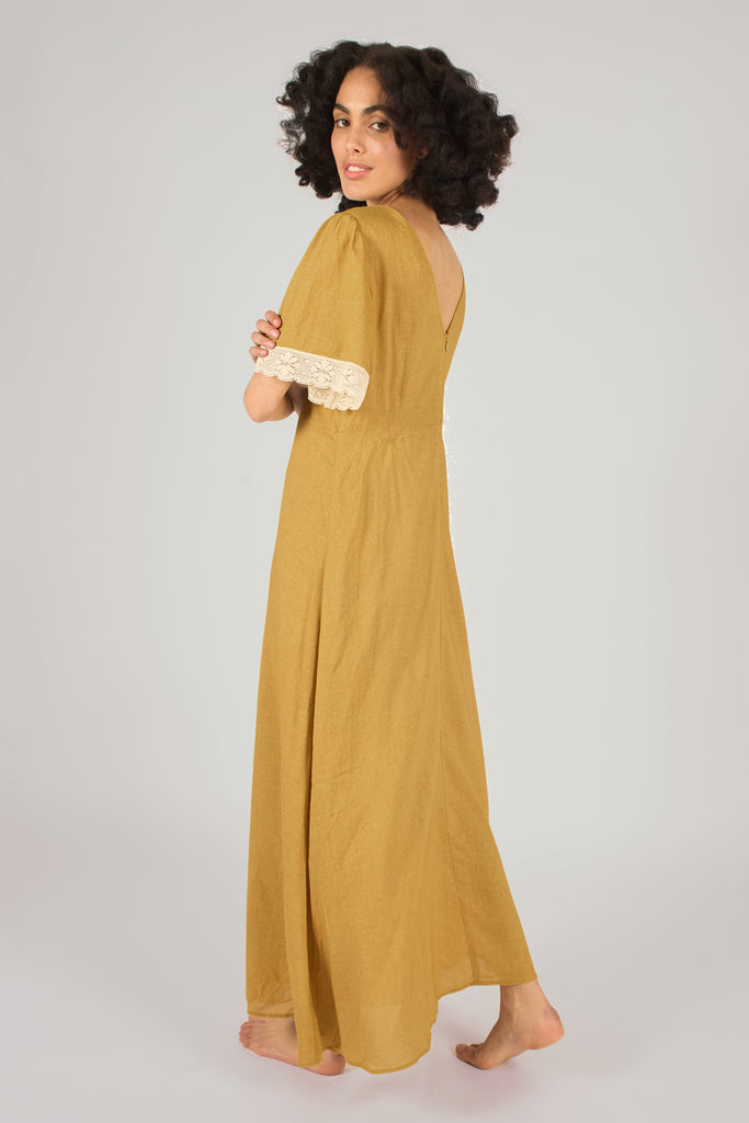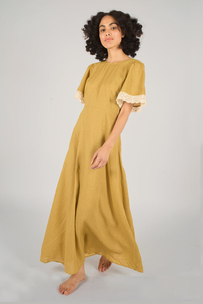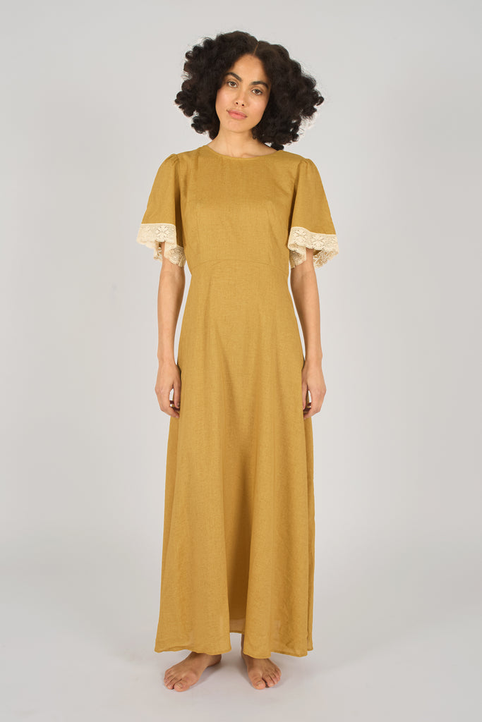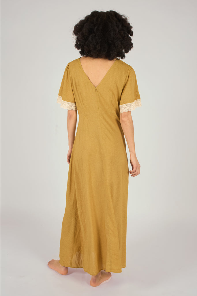 Our most-loved Rene dress is back in this gorgeous mustard yellow with cream lace trim. A stunning boho style maxi dress cut with elbow length trumpet sleeves and a slightly cinched waist, leaving you with the most flattering silhouette.