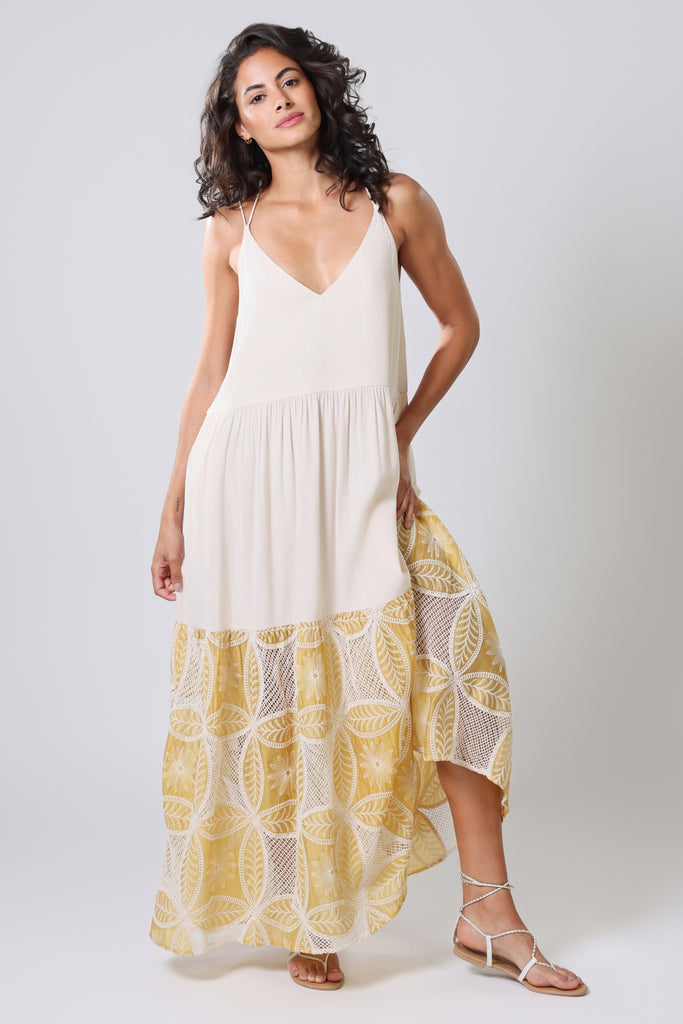 Our Ithaca Dress is sure to be your new summer staple. A beautiful sleeveless maxi sundress, with spaghetti straps which are tied at the neck, a flattering deep V-neckline, and a flattering trapeze silhouette. It's perfect for those hot summer holidays by the beach. In a simple cream, with a bright yellow floral mesh embroidered hem to add a pop or colour to your outfit.