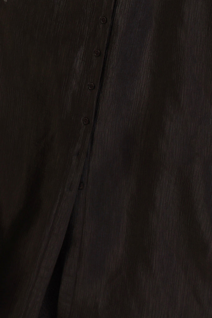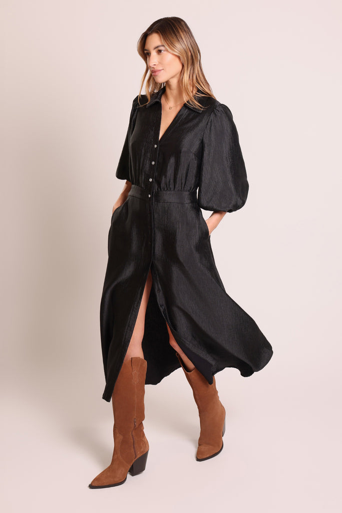 A beautiful midi dress which can easily be dressed up or down for all occasions. Featuring a V-Neck shirt collar, a button front opening, 3/4 billow sleeves, and a belt waist detail which cinches in the waist. Simply stunning in this smooth black fabric.