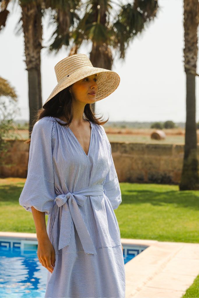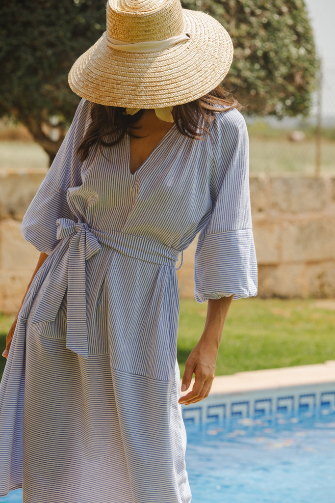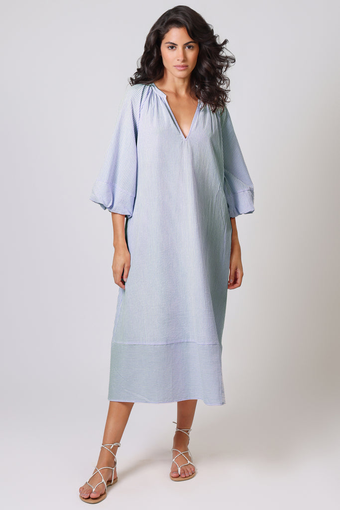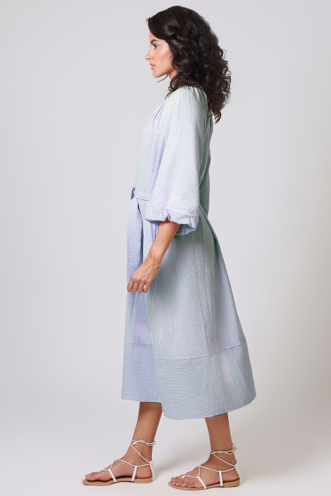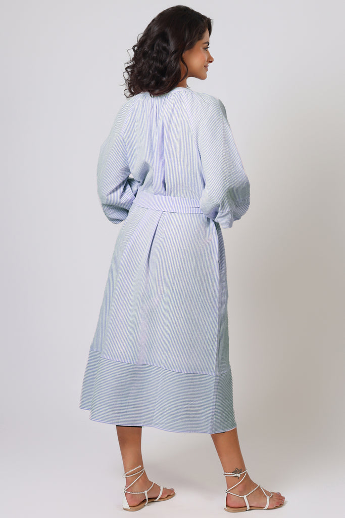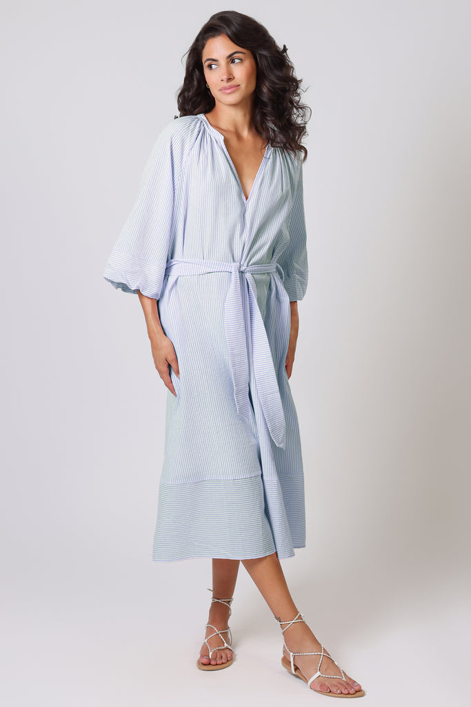 The Glee Dress has a perfect casual summer vibe in this pastel blue and white stripe, which makes it so easy to wear. With long balloon sleeves and a loose midi dress fit, it has a beautifully relaxed style which is sure to suit anyone. It comes with a belt which can be tied to cinch in the waist for a flattering silhouette. The ruched V-neckline gives the most beautiful texture to the dress.