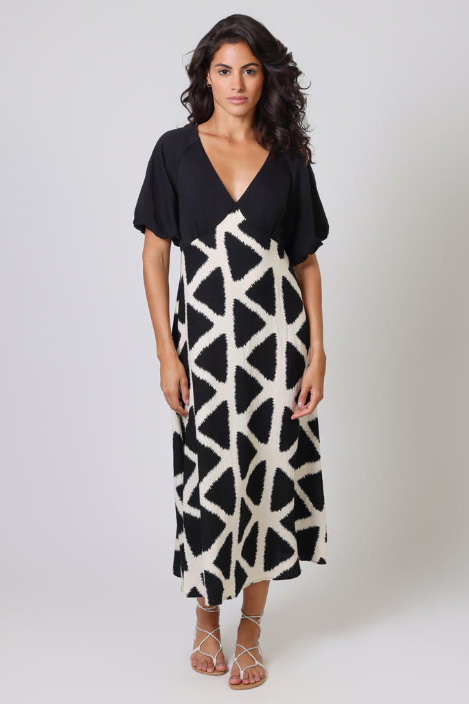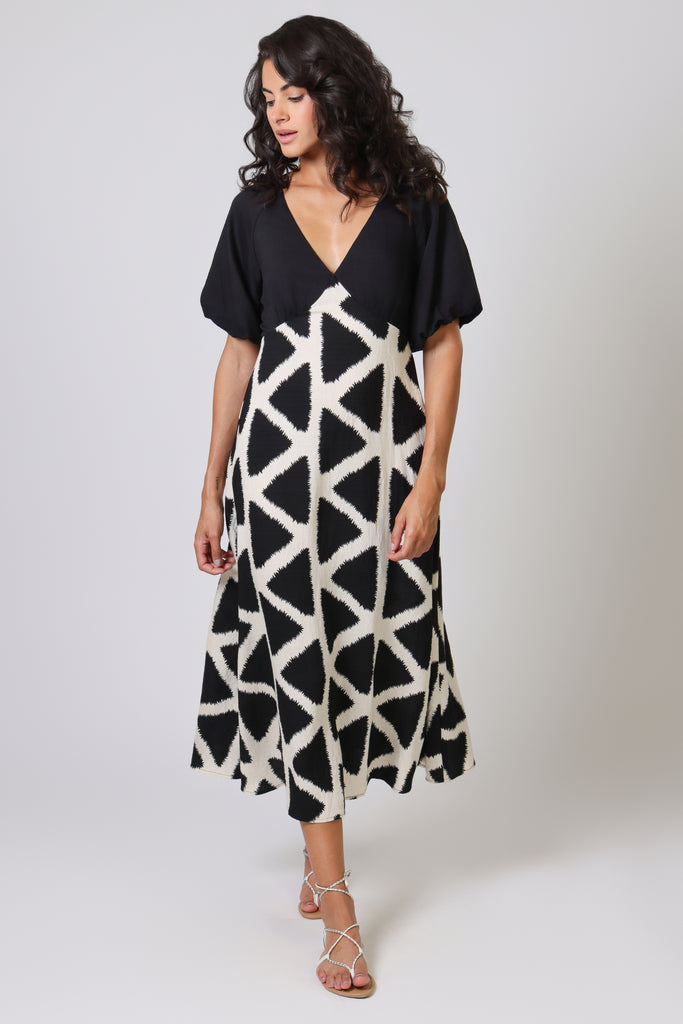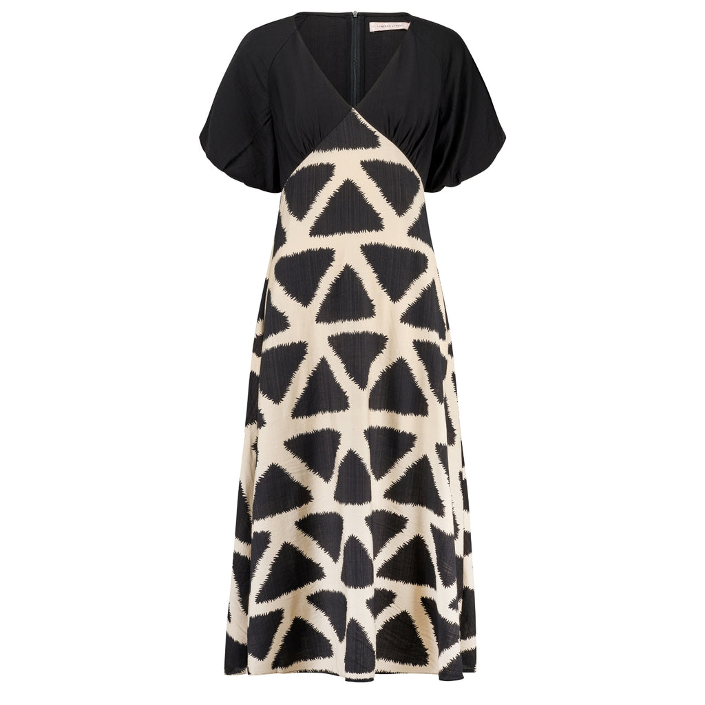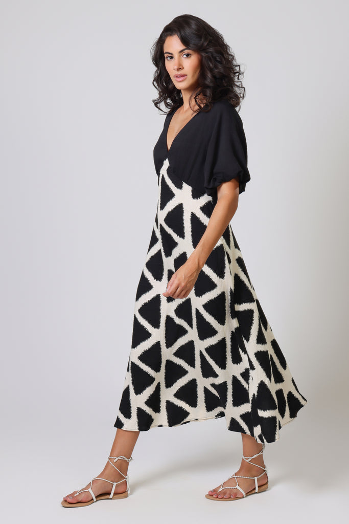 If you were a fan of our Gloria Dress, we're sure that you'll love our Evie Dress. It has a flattering deep V-neckline and short elasticated sleeves to make it all the more comfortable. The unique black and white contrast print creates the most beautiful silhouette. A stunning and versatile midi dress for your summer wardrobe. Keep it casual with sandals, or dress it up with heels for a beautiful summer wedding guest outfit.