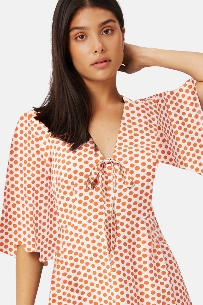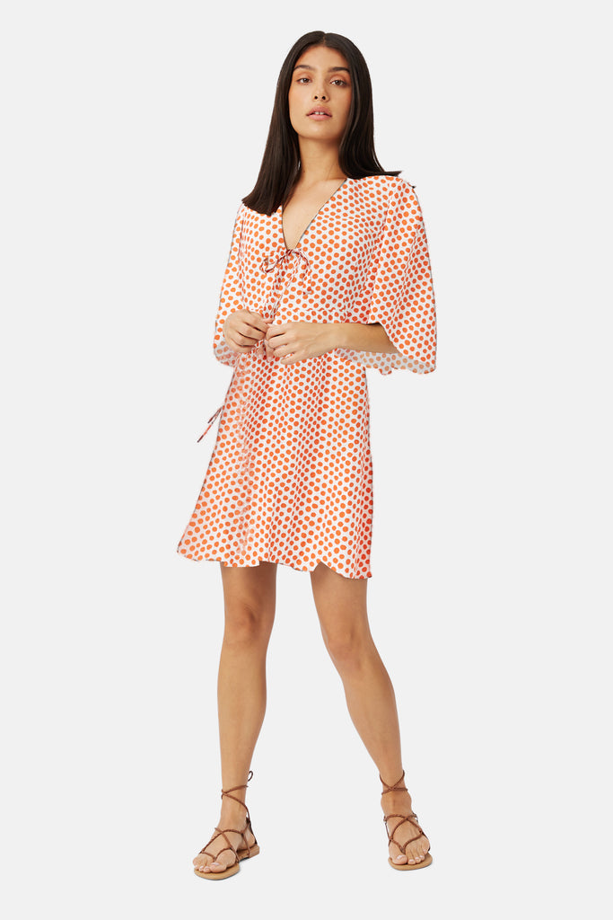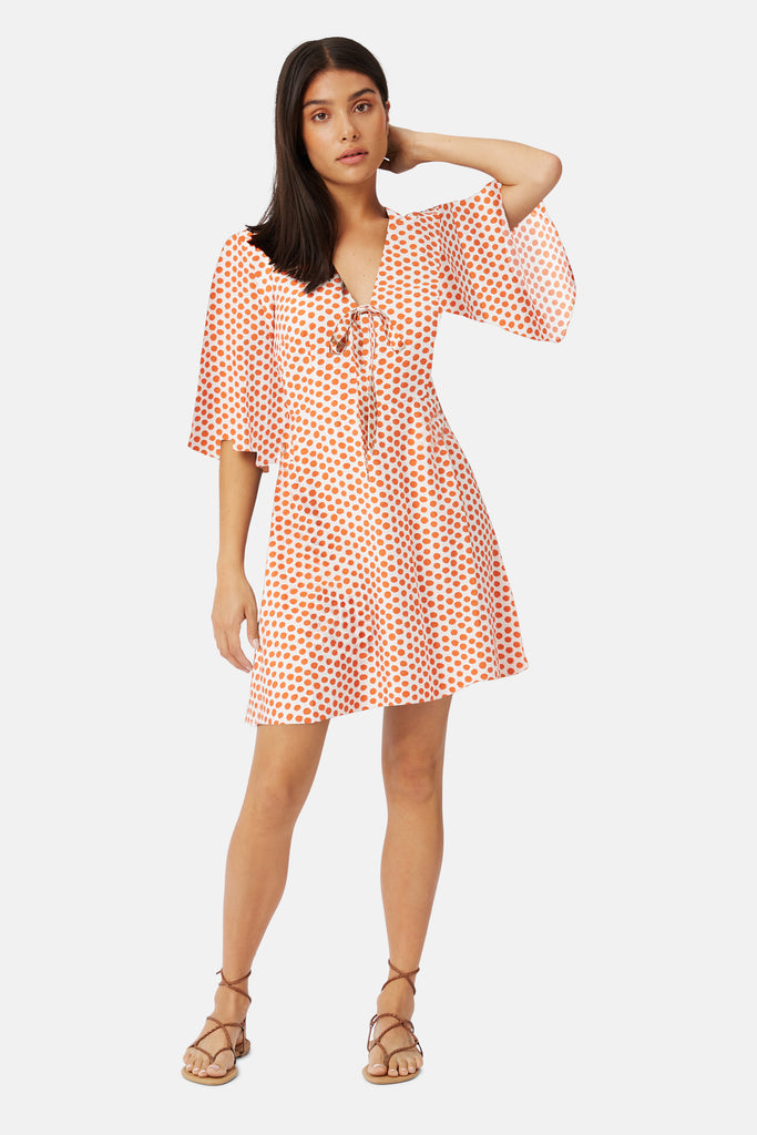 The gorgeous Little Lies Dress is cut with trumpet sleeves and a short A line hemline. A beautiful and flattering silhouette in our Not So Nuanced print . The low V neck with drawstring tie detail gives it a little edge. Back zip fastening.