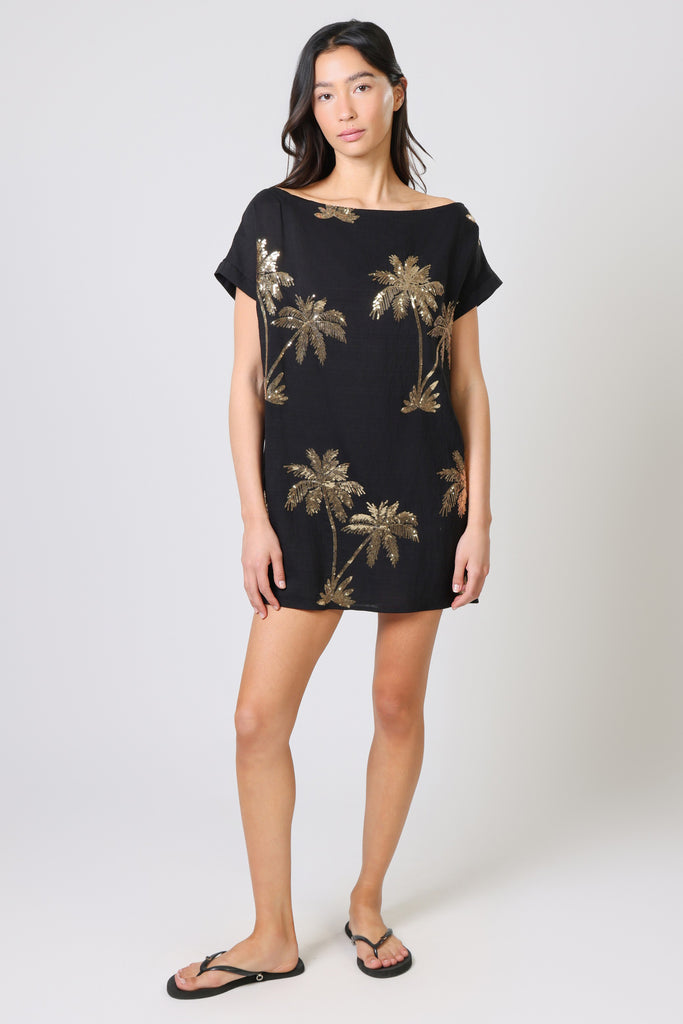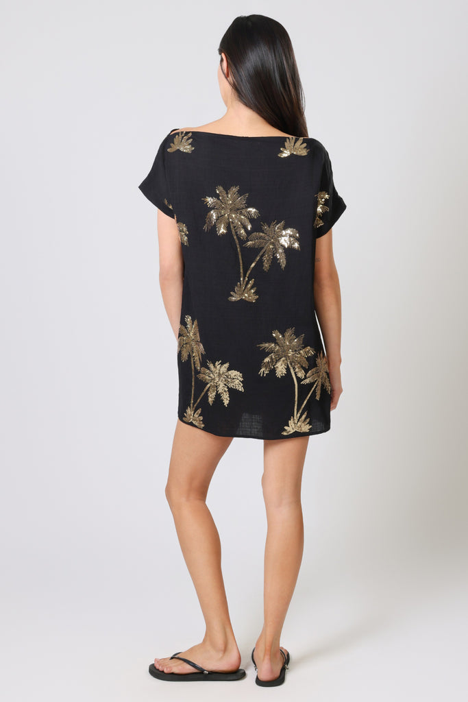 Add some sparkle to your summer wardrobe with our Flo Mini Dress. A simple, relaxed fit shift dress with the most flattering boat neckline for that boho style look, and short sleeves. So easy to wear in this black and gold palm tree sequin embellished cotton.