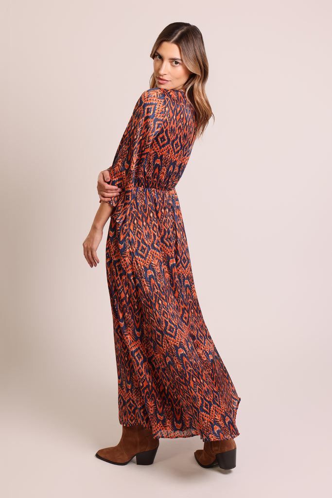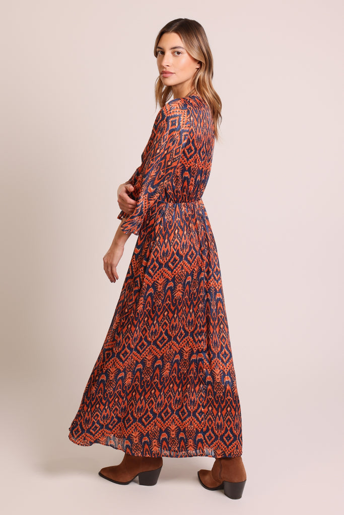 Our Millie dress is a gorgeous boho style maxi dress, with trumpet sleeves and an elasticated back waistband to give the most flattering silhouette. So unique in this bold orange and blue print. Featuring a back button peephole fastening. Lined.