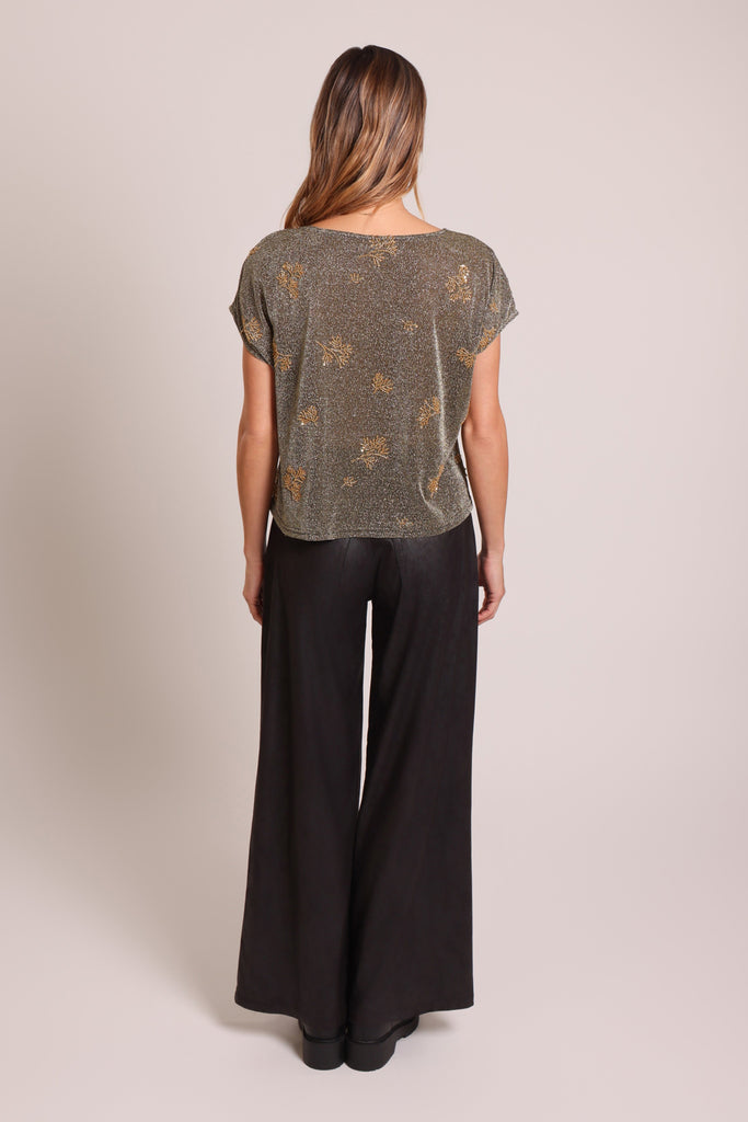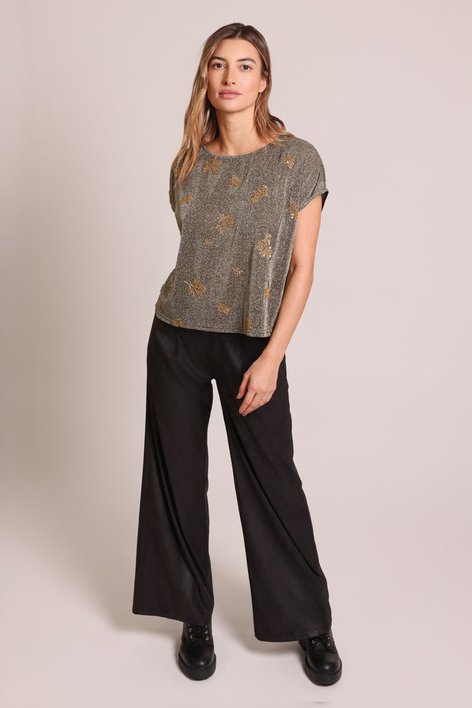 The Grace is a simple, yet elegant slouchy short sleeve top. The slightly oversized fit and round neckline make it all the more flattering. The perfect festive party piece in this stunning glittery fabric with beautiful gold beaded details.