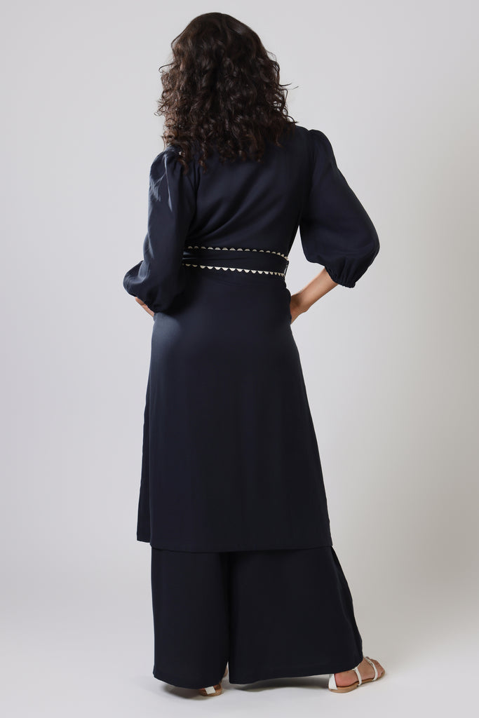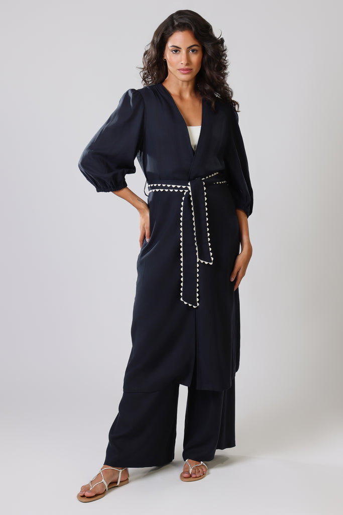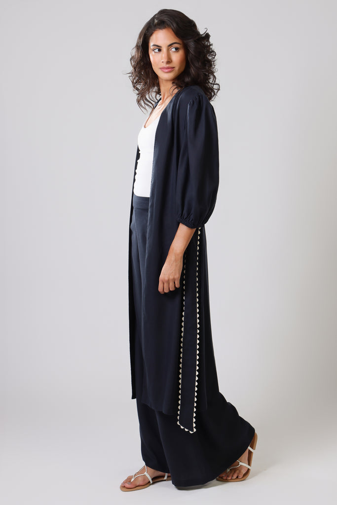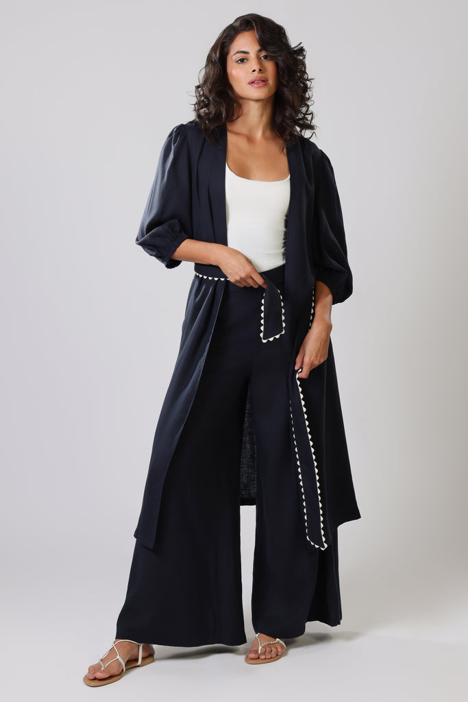 The Duster Dress Coat is a stunning piece to add to your Spring wardrobe, in the beautiful navy blue fabric with a white scallop trim belt. Featuring 3/4 puff sleeves with elasticated cuffs, and a simple belt fastening. Perfect for layering to create a stunning Spring outfit to suit any occasion.