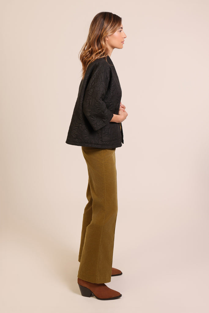 This stunning quilted shrug jacket comes in a cropped, boxy style fit with puffy sleeves and dropped shoulders for that perfectly relaxed look. It looks effortlessly chic in this black, floral embossed cotton blend fabric. So easy to style with any outfit.