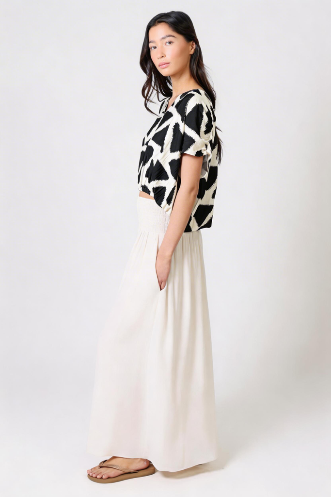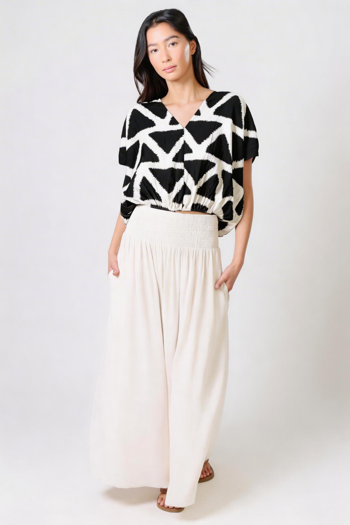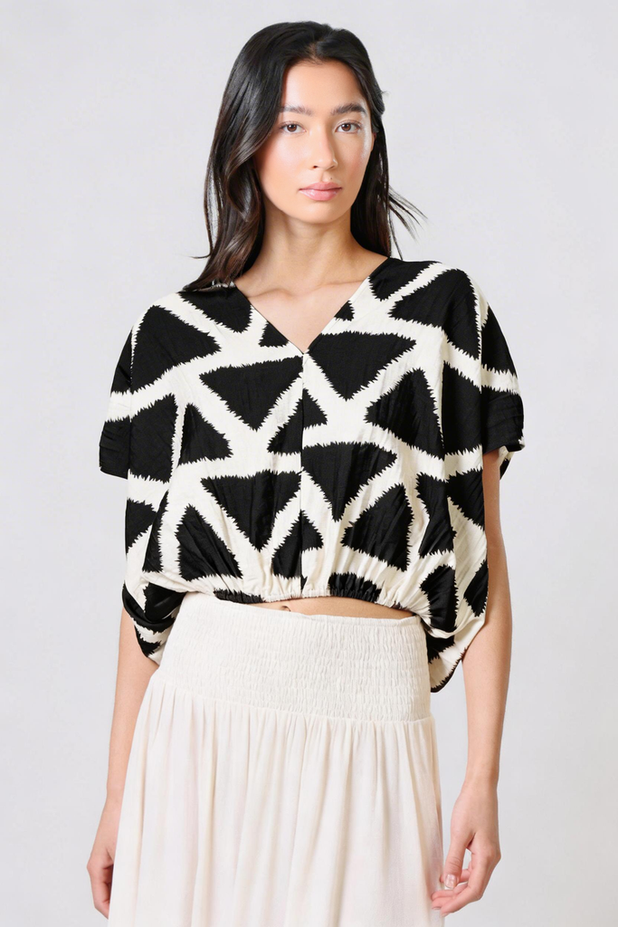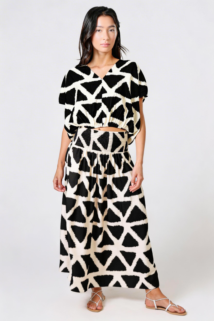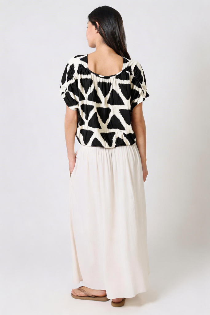 The Whispers Top gives the perfect casual summer boho vibe. A lightweight black and white geometric print women's top, with short sleeves, a V-neckline and a deep cut back. The elasticated waist creates a relaxed and comfortable silhouette. It pairs perfectly with our matching Aurora Skirt to create the perfect boho summer outfit.