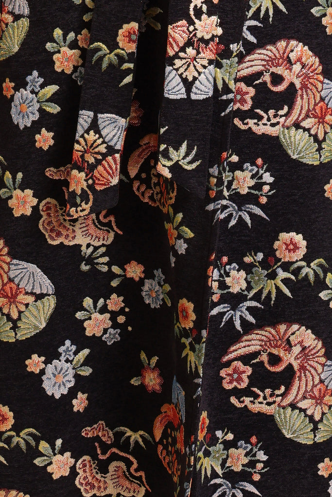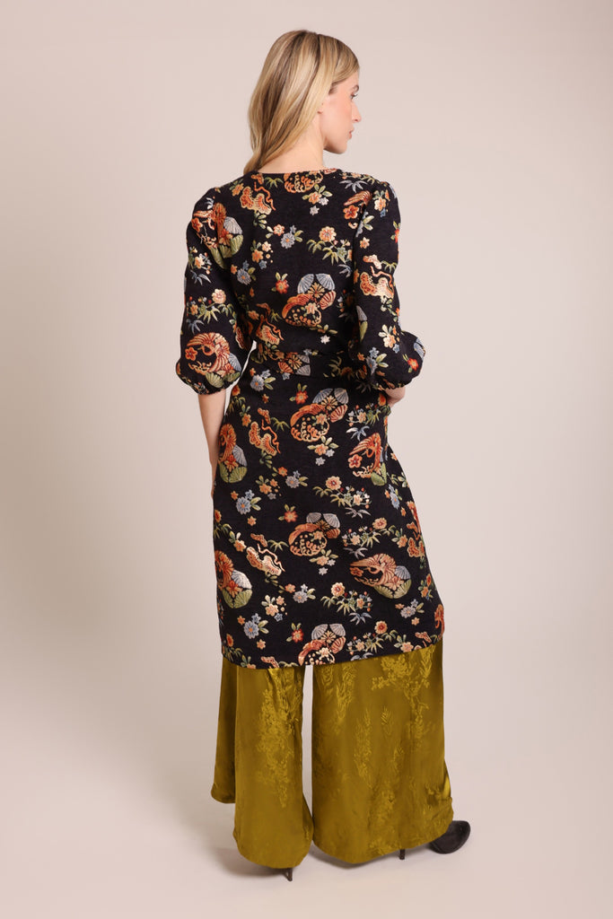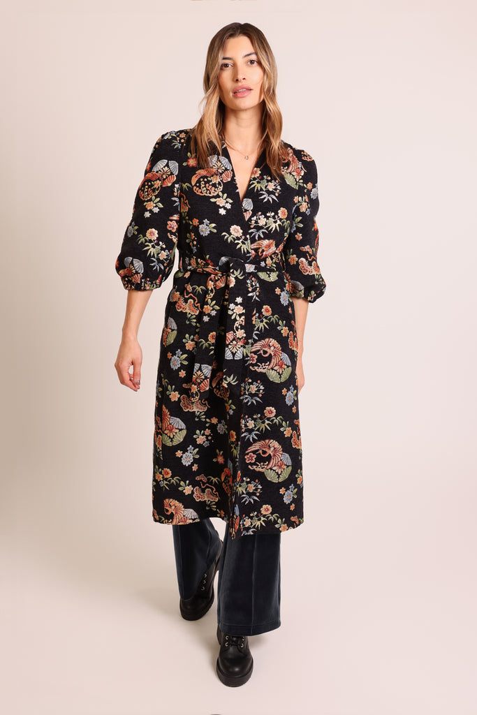 The Duster Dress Coat is a stunning piece to add to your winter wardrobe, in the beautiful black floral embroidery of this cotton blend fabric. Featuring 3/4 puff sleeves with elasticated cuffs, and a simple belt fastening. Perfect for layering to created a stunning winter outfit. Lined.