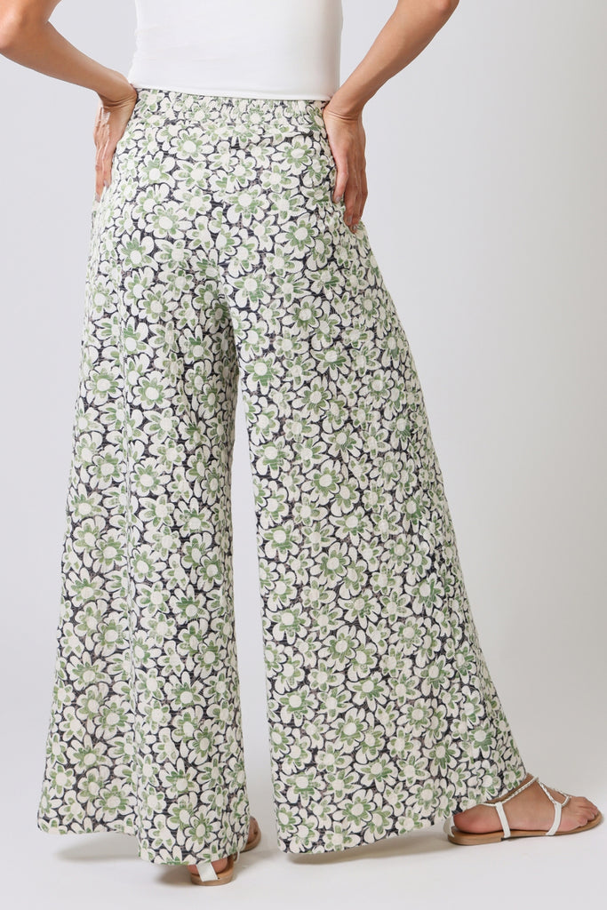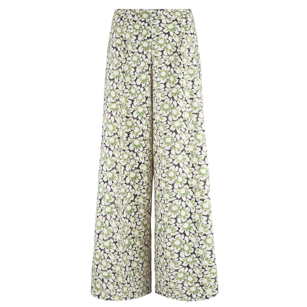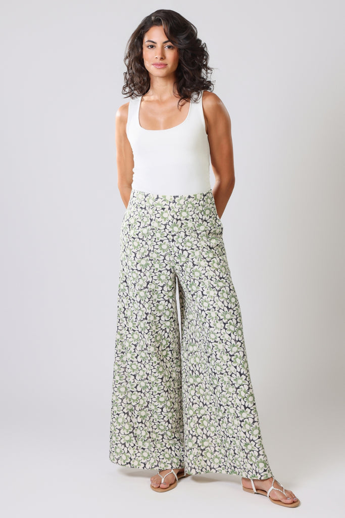 Our Rene trousers have the most comfortable wide leg fit. Featuring a flat front mid-rise waistband with elastic in the back to allow for a more comfortable fit. They have the essential side pockets and are finished with a side zip fastening. They bring the most perfect touch of Spring in this blue, green and white ditsy floral cotton.