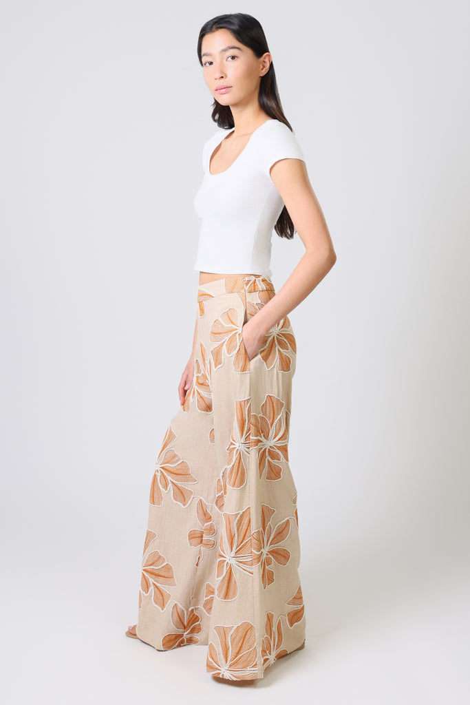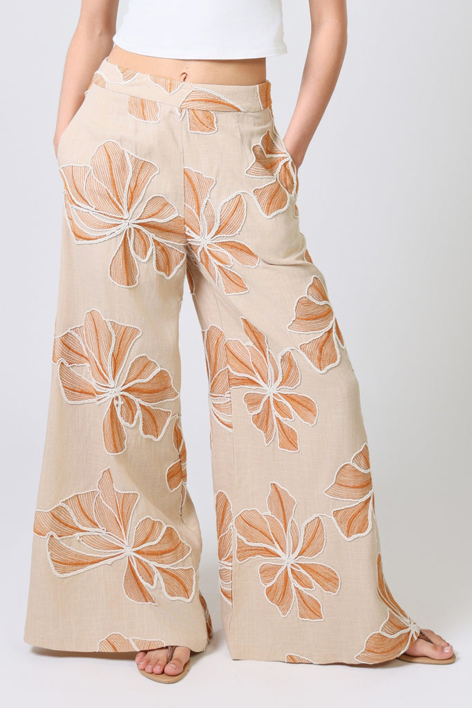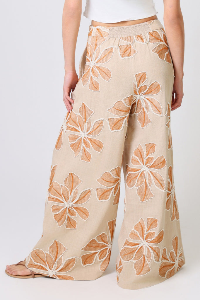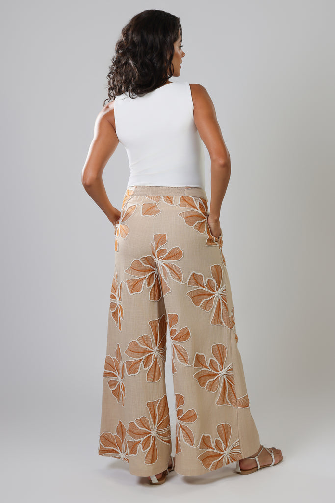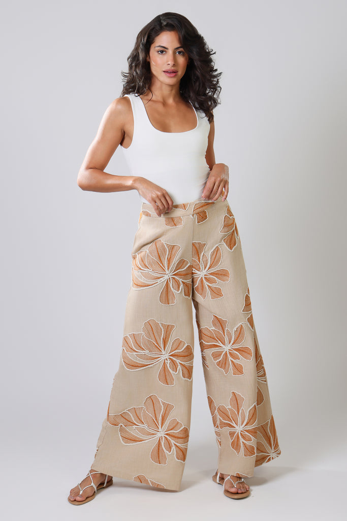 Our Rene women's trousers have the most comfortable wide leg fit. Featuring a flat front mid-rise waistband with smocked elastic in the back to allow for a more comfortable fit. They have the essential side pockets and are finished with a side zip fastening. Create the perfect soft summer vibes in this brown and white floral embellished linen. Just pair with our matching Bella Top for the full summer outfit.