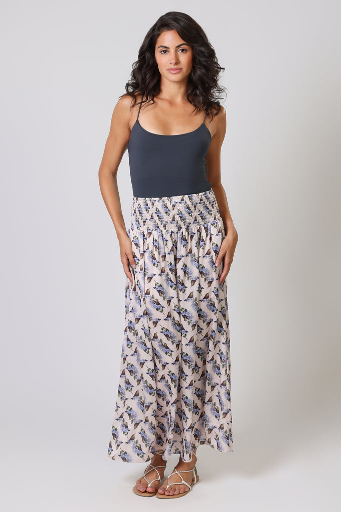 The Aurora Skirt has a classic A-Line shape, with an extra-wide elastic smocked waistband which is designed to allow for a low or high waist fit. Featuring side seam pockets. A stunning and versatile maxi skirt to add to your summer wardrobe. It has a unique white and blue bird floral print, bringing that perfect touch of Spring to any outfit.