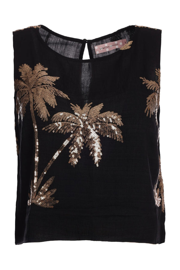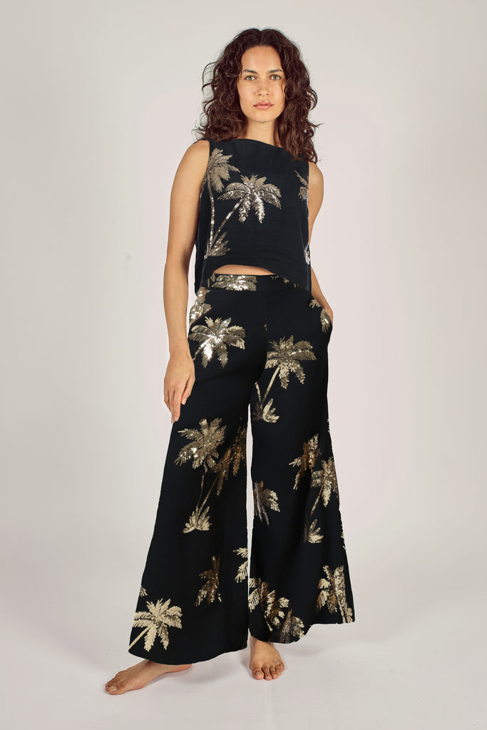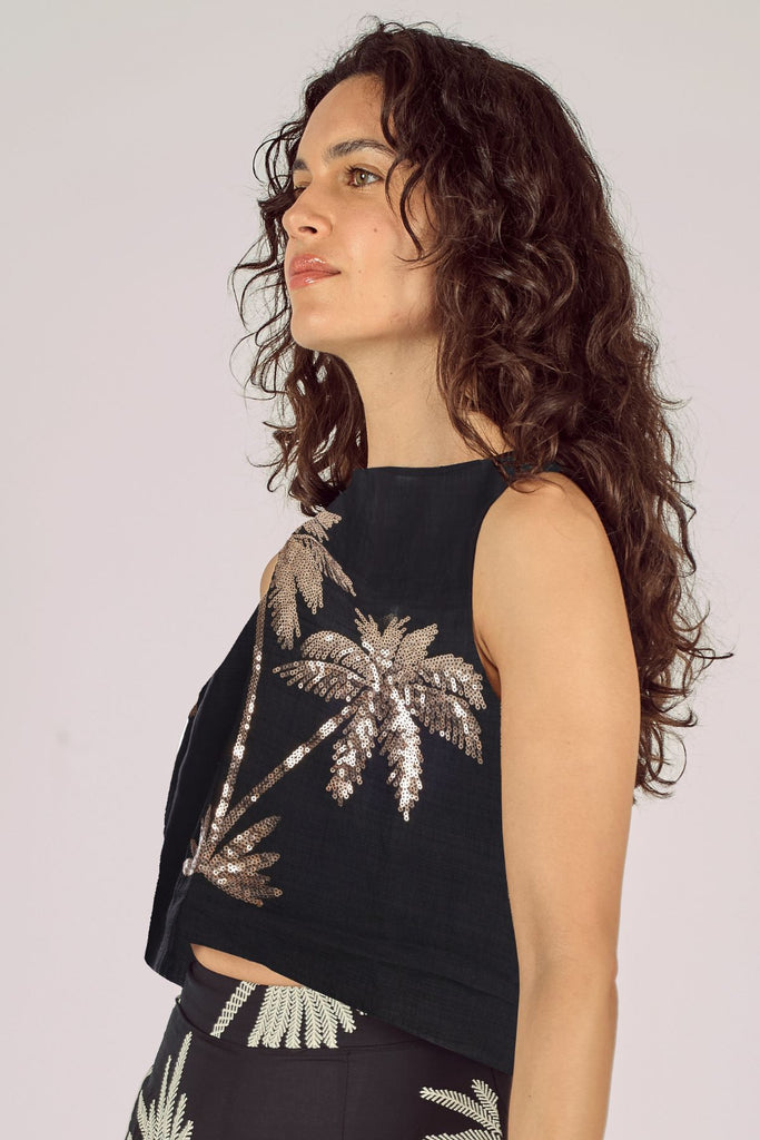 Our Evie top is a showstopper in this black and gold sequin palm tree embellished cotton fabric. A cropped, sleeveless women's top with a back peephole button fastening. It's so lightweight and comfortable, but great for dressing up any outfit. Just pair with our matching Rene Trousers for the full summer outfit.
