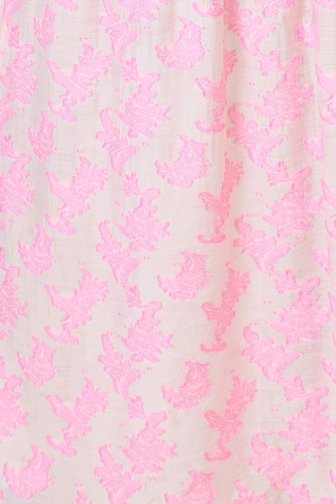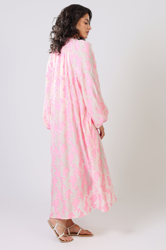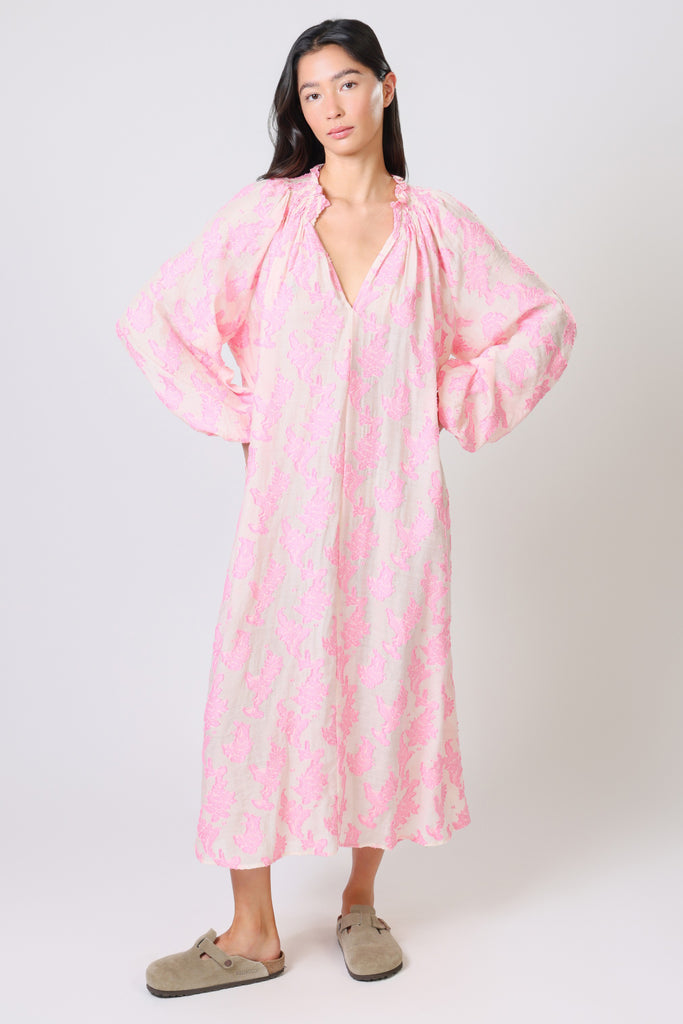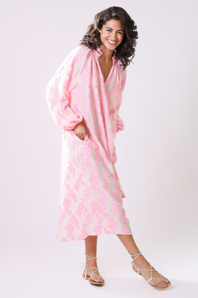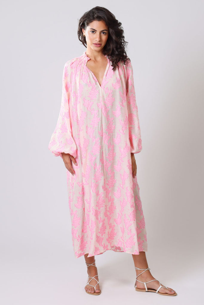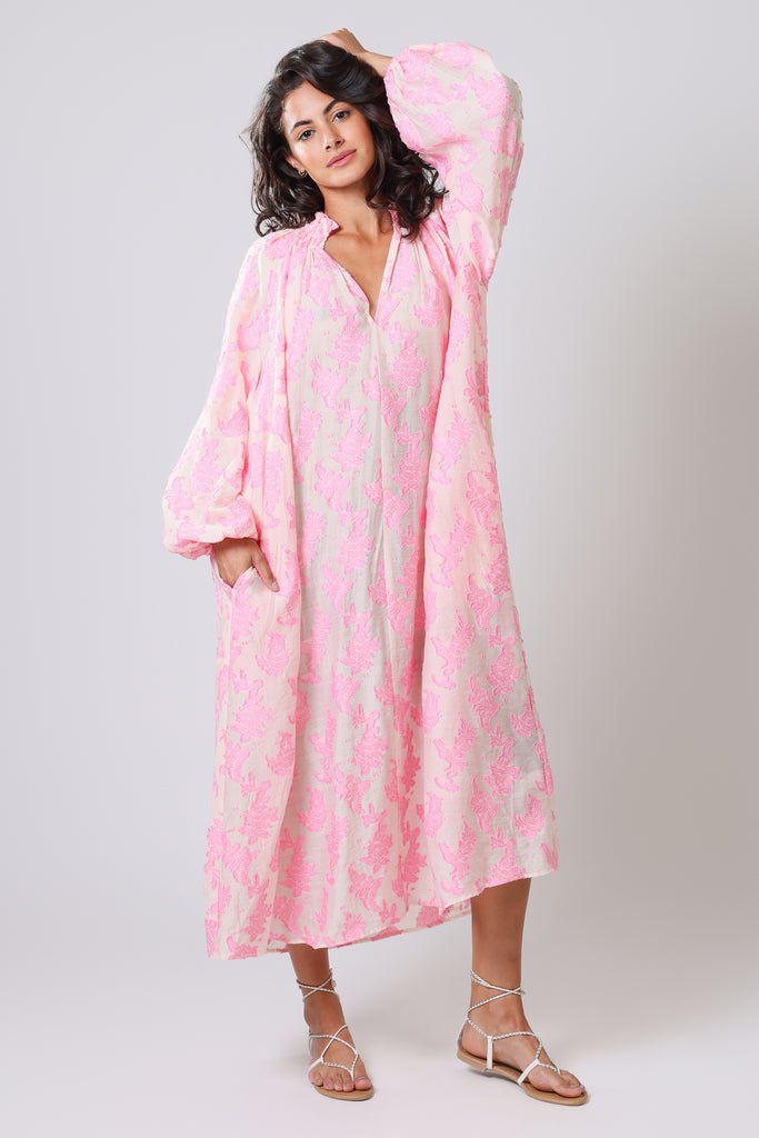 The Milo Dress has that perfect casual summer vibe. With long balloon sleeves and a loose midi dress fit, it has a beautifully relaxed style which is sure to suit anyone. The elasticated V-neckline gives the most beautiful ruched texture to the dress. In a bold, but soft pink and cream white floral embellished lightweight fabric.