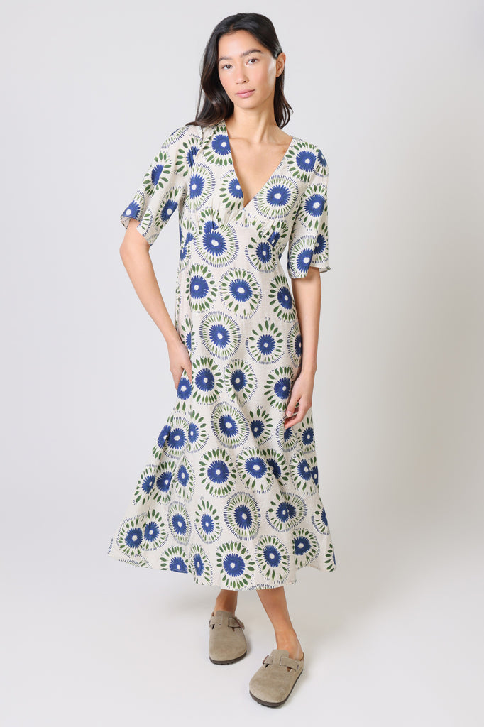 The Blythe Dress is perfect for summer in this white, blue and green print. A gorgeous deep V-neck midi dress, with flattering gathering on the bust and mid length trumpet sleeves which float beautifully in the breeze. Fastened with a back zip. The most versatile outfit, which can be easily dressed up or down to suit any occasion.
