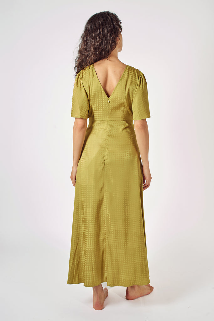 Our most-loved Rene dress is back in this subtle spot print olive green fabric. A stunning boho style maxi dress cut with elbow length trumpet sleeves and a slightly cinched waist, leaving you with the most flattering silhouette. Perfect to dress up for a summer wedding.