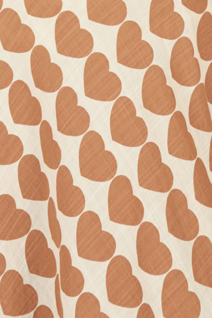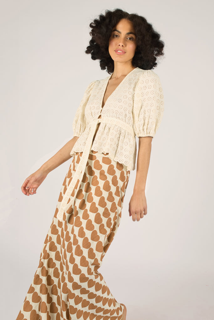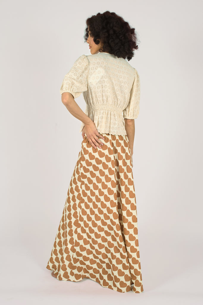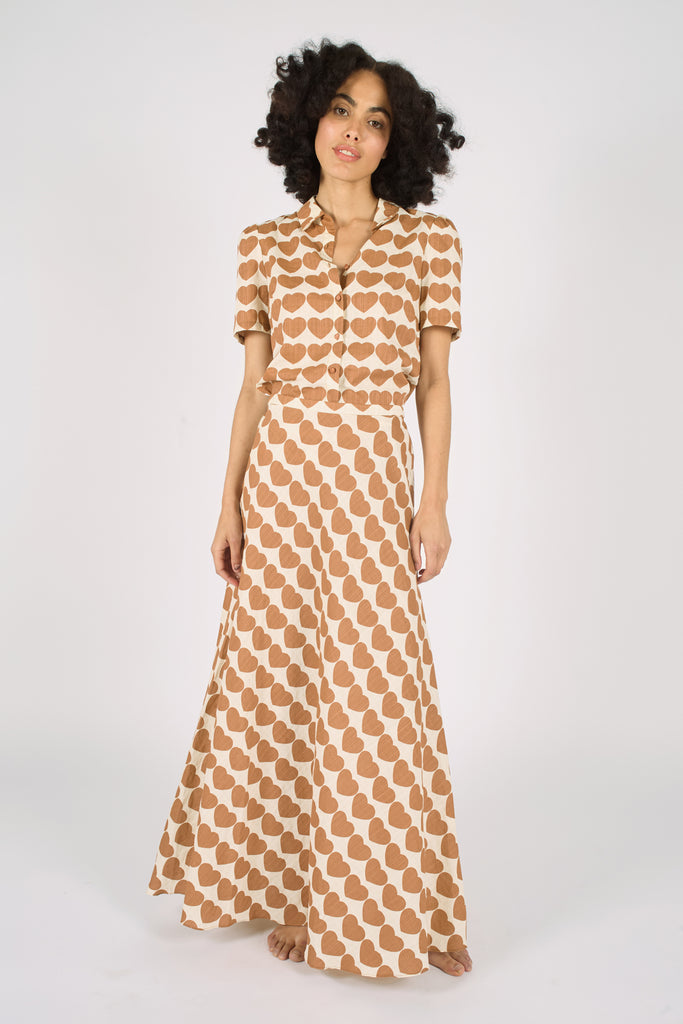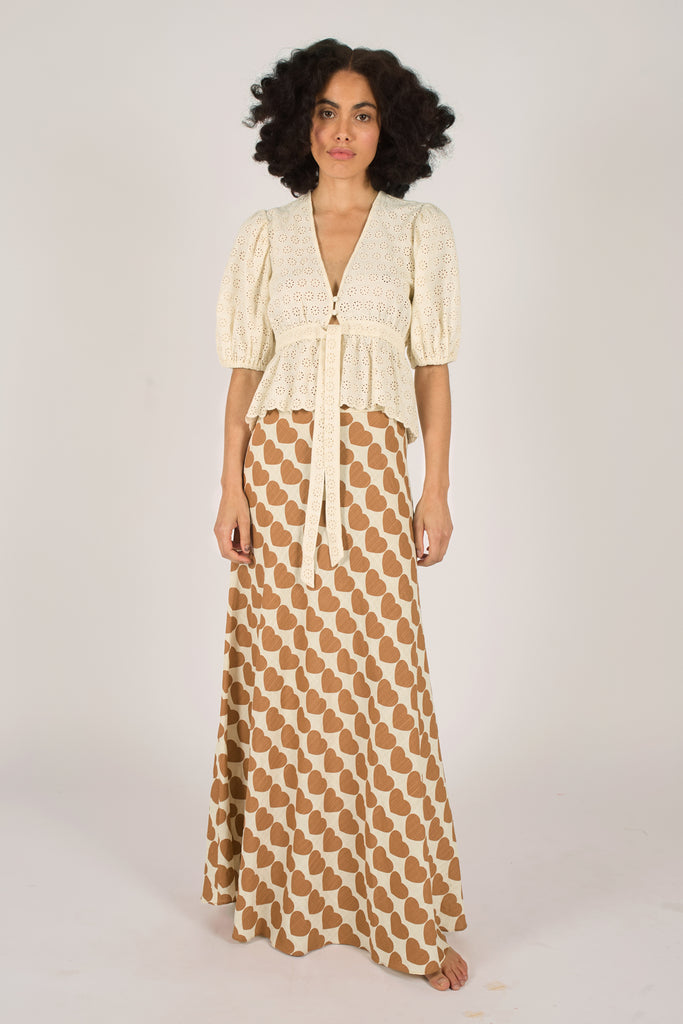 The Sade Skirt is sure to become a staple piece in your summer wardrobe. The most flattering maxi skirt in a bias cut. The elasticated waistband at the back helps to make it the most comfortable boho style skirt. It looks stunning in this cream and brown 60's style heart print.