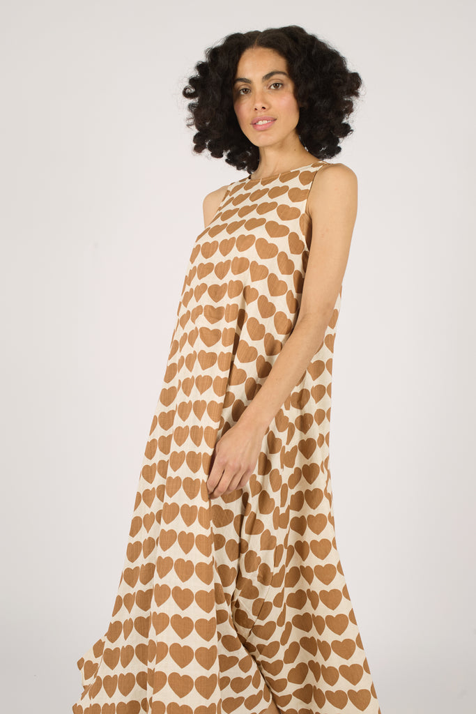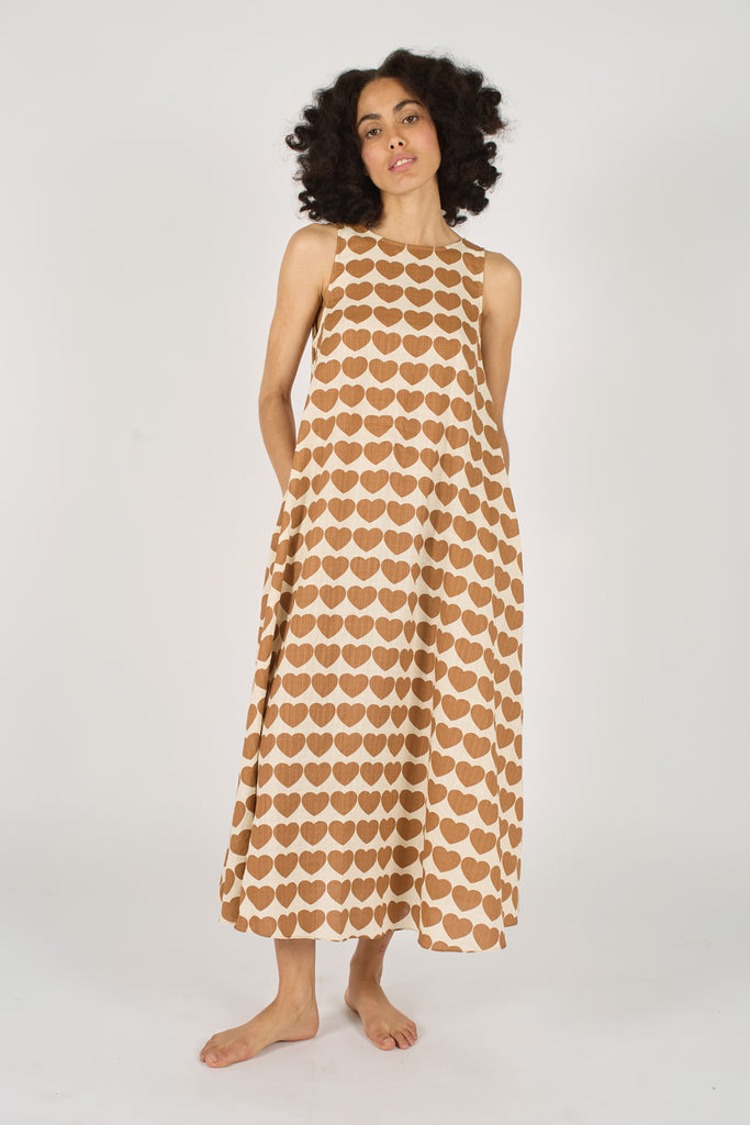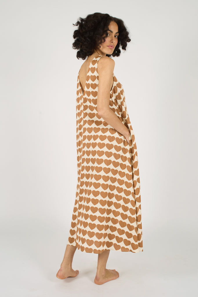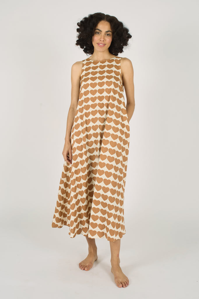 The Tribe Dress is a simple sleeveless shift style midi dress, but looks effortlessly chic in our cream and brown heart print 60's style print. With a V Neck back and side pockets. The loose flowing fit makes it the perfect versatile piece for all styles.