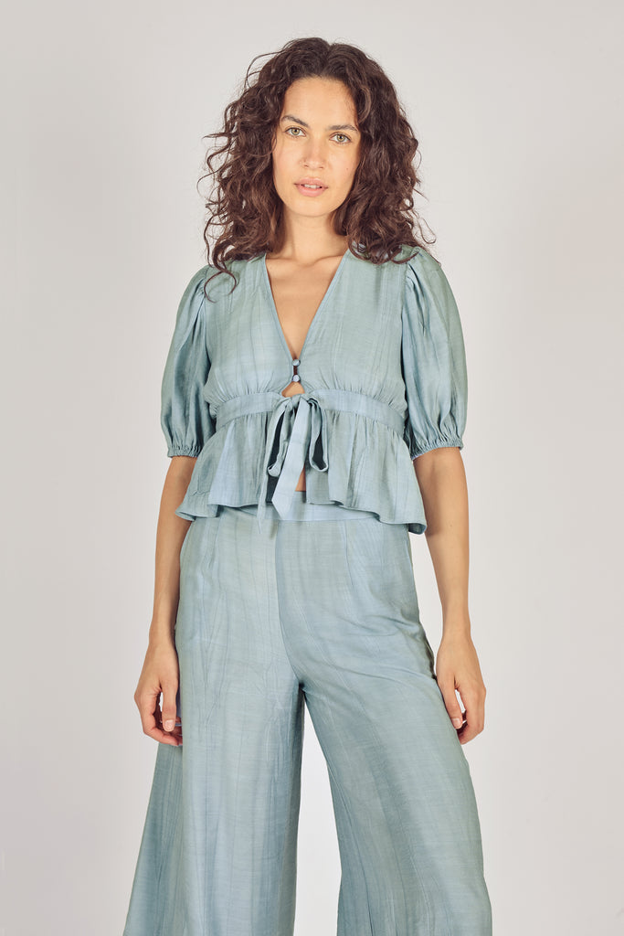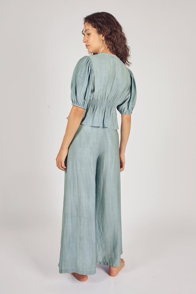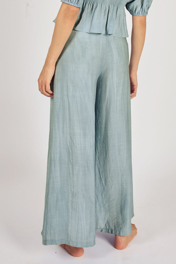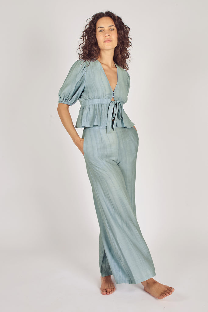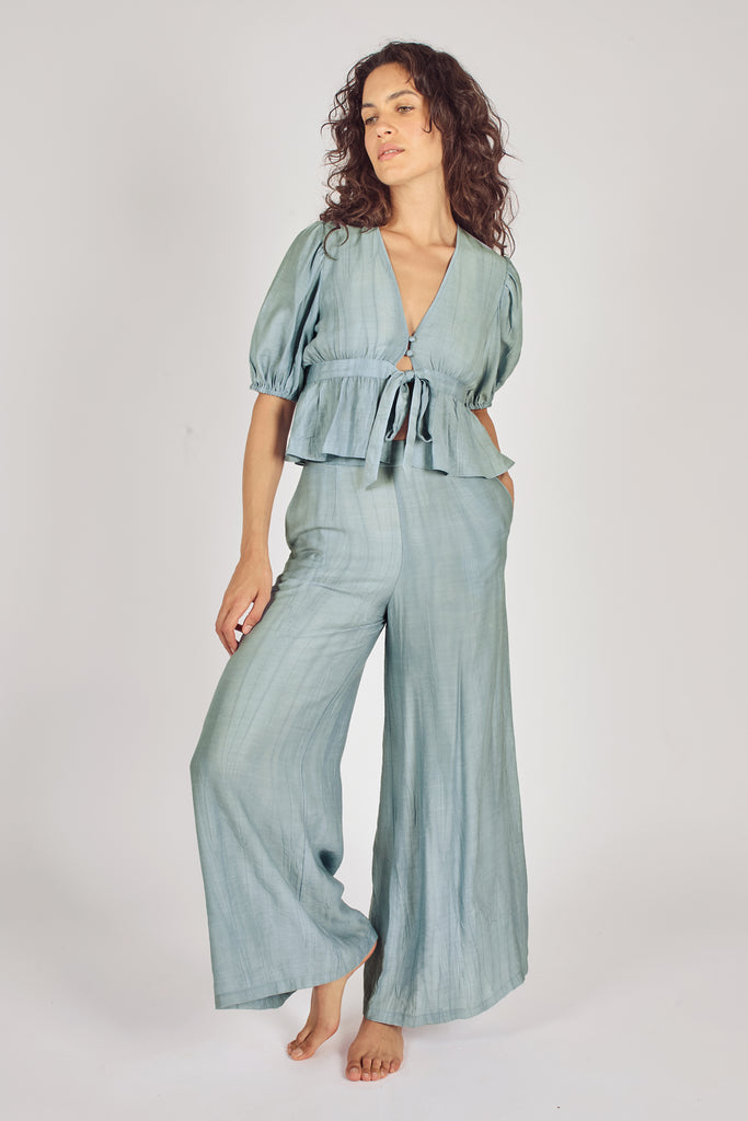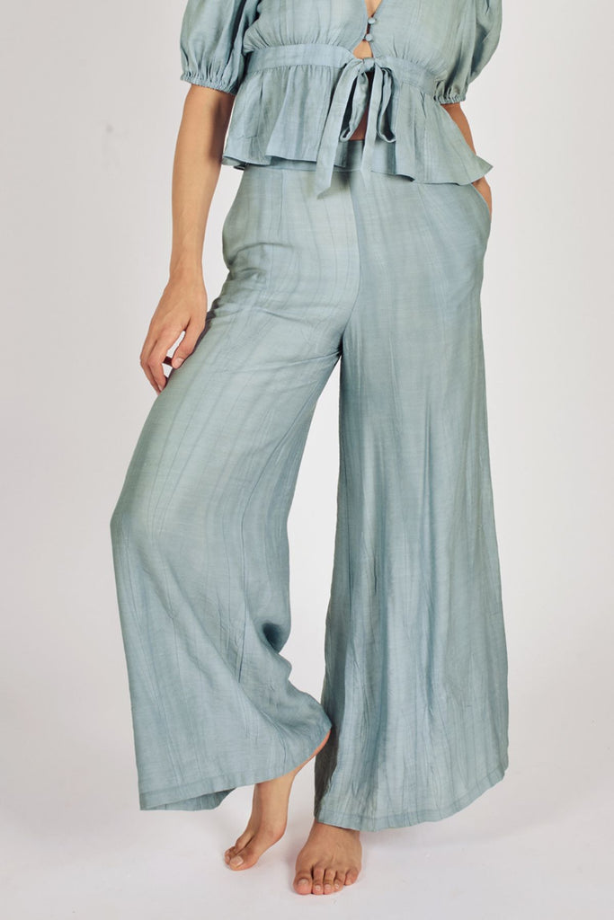 These wide leg trousers are light and breezy in this soft baby blue tone. Featuring an elasticated waistband for added comfort, and the essential pockets. Style with any top you like for a relaxed summer outfit. Pair with our matching Margot top for the full summer outfit, perfect for a holiday by the beach.