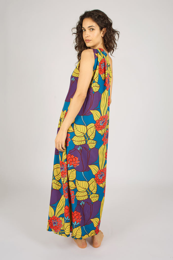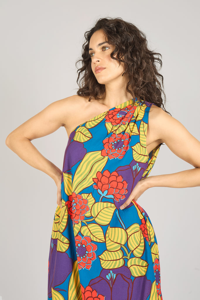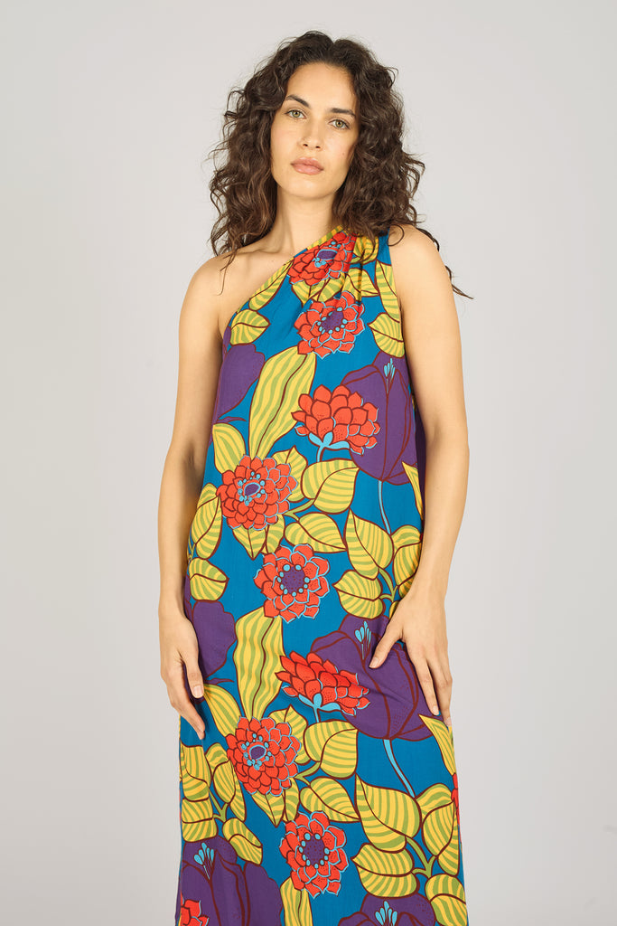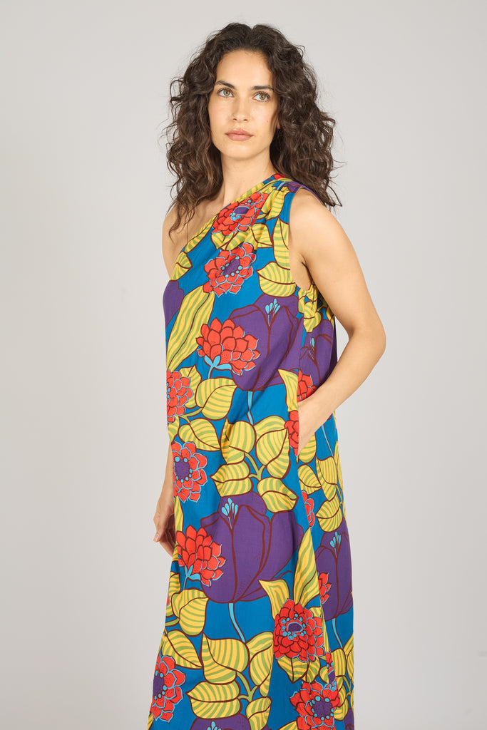 The Gia maxi dress is stunning in this bold blue and red floral print. A unique one sleeve silhouette - loose and flowing for those hot summer days. Just pair with sandals for the perfect day to night holiday outfit.